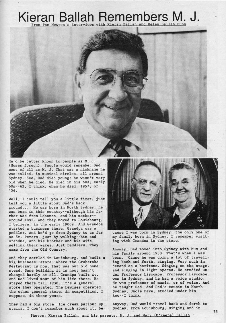Published by Ronald Caplan on 1988/6/1 (239 reads)Kieran Ballah Remembers M. J, From Pam Newton's interviews with Kieran Ballah and Helen Ballah Dunn He'd be better known to people as M. J. (Moses Joseph). People would remember Dad most of all as M. J. That was a nickname he was called, in musical circles, all around Sydney. See, Dad died young; he wasn't very old when he died. He died in his 60s, early 60s--63, I think, when he died. 1957, or '56. Well, I could tell you a little first, just tell you a little about Dad's back? ground.... He was born in North Sydney; he was born in this country--although his fa? ther was from Lebanon, and his mother-- around 1892. And they moved to Louisbourg, I believe, in the early 1900s. And Grandpa started a business there. Grandpa was a peddler. And he'd go from Sydney to as far as St. Peters, just by walking--him and Grandma, and his brother and his wife, selling their wares. Just peddlers. They came from the Old Country. And they settled in Louisbourg, and built a big business--store--where the Grubstake Restaurant is now, that was our old home? stead. Same building it is now; hasn't changed hardly at all. Grandpa built it. And Dad lived most of his life there. He stayed there till 1930. It's a general store they operated. The Lewises operated the other general store, in competition, I suppose, in those years. They had a big store. Ice cream parlour up? stairs. I don't remember much about it, be? cause I was born in Sydney--the only one of my family born in Sydney. I remember visit? ing with Grandma in the store. Anjrway, Dad moved into Sydney with Mum and his family around 1930. That's when I was born. 'Cause he was doing a lot of travell? ing back and forth, singing. Very much in demand as a baritone. Singing on the stage, and singing in light operas. He studied un? der Professor Liscombe. Professor Liscombe was in Sydney, and he had a voice studio. He was professor of music, or of voice. And he taught Dad. And Dad's cousin in North Sydney, Uncle Dave, studied under him, too--I think. Anjrway, Dad would travel back and forth to Sydney. From Louisbourg, singing and in PhQtOS; Ki'r'n Bgll'h. ahd his pargntig. M. J. 'nd Mary (O'Keefe) B'llgih 75