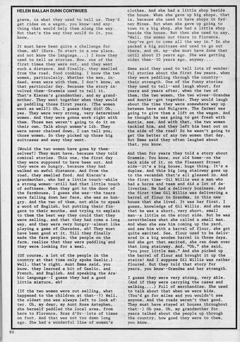 Published by Ronald Caplan on 1988/6/1 (225 reads)HELEN BALLAH DUNN CONTINUES grave, is what they used to tell us. They'd get rides on a wagon, you know--and any? thing that would help them along the way. But that's the way they would do it, you know. It must have been quite a challenge for them, eh? (Sure. To start in a new place, and not know the language....) I know they used to tell us stories. Now, one of the first times they were out, and they went such a distance. And finally, they smelled from the road, food cooking. I know the two women, particularly. Whether the men, in? deed, even were with them, I don't know, on that particular day. Because the story in? volved them--Grammie used to tell it. That's Kieran's grandmother, and my grand? mother. They went together when they would go peddling those first years. (The women went as well?) Oh, I guess they did! Oh, yes. They were very strong, very determined women. And they were gonna work right with them. Those men weren't going to do it on their own. Talk aboift women's lib. They were never chained down, I can tell you, those women. So they picked up those big suitcases and away they went. (Would the two women have gone by them? selves?) They must have, because they told comical stories. This one, the first day they were supposed to have been out. And they were so hungry, because they had walked an awful distance. And from the road, they smelled food. And Kieran's grandmother, who had a little touch--while a strong woman--still had that little touch of softness. When they got to the door of the farmhouse, I guess she was--the tears were falling down her face, she was so hun? gry. And the two of them, not able to speak a word of English, but putting their fin? gers to their mouths, and trying to explain to them the best way they could that they were selling, and that they had come a long way, and they were very hungry--almost like playing a game of Charades, eh? They must have been good at it. Till they finally made the farm people, the people on the farm, realize that they were peddling and they were looking for a meal. (Of course, a lot of the people in the country at that time only spoke Gaelic.) Well, that's right. Aunt Emma said, you know, they learned a bit of Gaelic, and French, and English. And speaking the Ara? bic language--I guess they had a good little mixture, eh? (If the two women were out selling, what happened to the children at that--?) Well, the oldest one was always left to look af? ter. Oh, my dear, my Aunt Rose Astephen, she herself peddled the local area, from here to Florence, Bras d'Or--lots of times on foot. And that was not too damn long ago. She had a wonderful line of women's clothes. And she had a little shop beside the house. When she gave up big shops, that is, because she used to have shops in Syd? ney Mines. But when she gave up going to town to a big shop, she had a little shop beside the house. But then she used to say, "Well, the women out there in Florence, they've got to come all the way in." So she packed a big suitcase and used to go out there, and oh, my--she must have done that until about 25 years ago. She was getting older then--30 years ago, anyway.... Emma said they used to tell lots of wonder? ful stories about the first few years, when they were peddling through the country-- their strength. One of the funny stories they used to tell--and laugh about, for years and years after, when the two of them, the two women, the two wives--Grandma and Auntie--got together. They would laugh about the time they were somewhere way up between here and Mulgrave. The farmer was going to give them a lift on the wagon. And he thought he was going to get fresh with Auntie, see. And with that, the two women tackled him, and they left him beat out on the side of the road! So he wasn't going to get the better of any two women that day. But Emma said they often laughed about that, you know. And then for years they told a story about Grammie. You know, our old home--on the back side of it, on the Pleasant Street side--it's a big house, huge thing. It's a duplex. And this big long stairway goes up to the verandah that's all glassed in. And the first time--Gil Willis was a man who had a horse and team and did a lot of de? liveries. He had a delivery business. And the first time Gil Willis was delivering a barrel of flour to Grandma, in this new house that she lived. It was her first, I guess, knowledge of Gil Willis. And she saw that he was a short, very short, small man--a little on the stout side. But he was nevertheless what she called a small man. And when she saw him coming up the yard, and saw him with a barrel of flour, she got quite excited. See, flour used to be deliv? ered in a big wooden barrel in those days. And she got that excited, she ran down over that long stairway. And, "Oh," she said, "you poor little man." And she picked up the barrel of flour and brought it up the stairs! And I suppose Gil Willis was rather floored. But they told that story for years, you know--Grandma and her strength. I guess they were very strong, very able. (And if they were carrying the cases and walking....) Full of merchandise. She used to talk about that when we were kids. (You'd go for miles and you wouldn't see anyone. And the roads weren't that good. They must have stayed at houses throughout that--) Oh yes. Oh, my grandmother for years talked about the people up through the country, how good they were to them, you know.