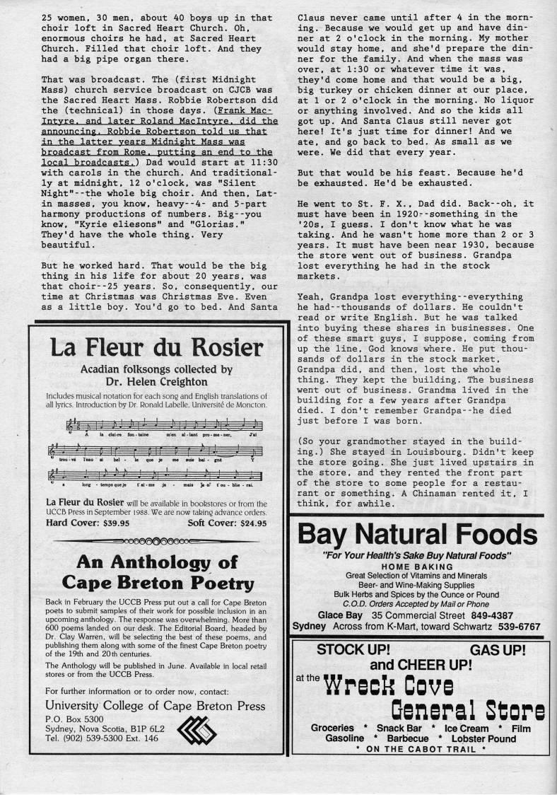 Published by Ronald Caplan on 1988/6/1 (238 reads)25 women, 30 men, about 40 boys up in that choir loft in Sacred Heart Church. Oh, enormous choirs he had, at Sacred Heart Church. Filled that choir loft. And they had a big pipe organ there. That was broadcast. The (first Midnight Mass) church service broadcast on CJCB was the Sacred Heart Mass. Robbie Robertson did the (technical) in those days. (Frank Mac? lntyre. and later Roland Maclntyre. did the announcing. Robbie Robertson told us that in the latter years Midnight Mass was broadcast from Rome, putting an end to the local broadcasts.) Dad would start at 11:30 with carols in the church. And traditional? ly at midnight, 12 o'clock, was "Silent Night"--the whole big choir. And then, Lat? in masses, you know, heavy--4- and 5-part harmony productions of numbers. Big--you know, "Kyrie eliesons" and "Glorias." They'd have the whole thing. Very beautiful. But he worked hard. That would be the big thing in his life for about 20 years, was that choir--25 years. So, consequently, our time at Christmas was Christmas Eve. Even as a little boy. You'd go to bed. And Santa La Fleur du Rosier Acadian folksongs collected by Dr. Helen Creighton Includes musical notation for each song and English translations of all lyrics. Introduction by Dr. Ronald Labelle, Universite de Moncton. 0 m fe ' ' txm-vt A I'eau rfcz: 1 I > J Jl 1 J. = ff 1 f" p P ??i bel ?? le que 1!' J' !> j } h=', je me ?f4= J ' J =J=' • oil bu . ='=h J'|J. . J. J got '' Nn j'?i f, 1 Y =' lone ' temps que je m.i. 3. rf La Fleur du Rosier will be available in bookstores or from the UCCB Press in September 1988. We are now tabing advance orders, Hard Cover: $39.95 Soft Cover: $24.95 An Anthology of Cape Breton Poetry Back in February the UCCB Press put out a call for Cape Breton poets to submit samples of their work for possible inclusion in an upcoming anthology. The response was overwhelming. More than 600 poems landed on our desk. The Editorial Board, headed by Dr. Clay Warren, will be selecting the best of these poems, and publishing them along with some of the finest Cape Breton poetry of the 19th and 20 th centuries. The Anthology will be published in June. Available in local retail stores or from the UCCB Press. For further information or to order now, contact: University College of Cape Breton Press P.O. Box 5300 Sydney, Nova Scotia, BIP 6L2 Tel. (902) 539-5300 Ext. 146 Claus never came until after 4 in the morn? ing. Because we would get up and have din? ner at 2 o'clock in the morning. My mother would stay home, and she'd prepare the din? ner for the family. And when the mass was over, at 1:30 or whatever time it was, they'd come home and that would be a big, big turkey or chicken dinner at our place, at 1 or 2 o'clock in the morning. No liquor or anything involved. And so the kids all got up. And Santa Claus still never got here! It's just time for dinner! And we ate, and go back to bed. As small as we were. We did that every year. But that would be his feast. Because he'd be exhausted. He'd be exhausted. He went to St. F. X., Dad did. Back--oh. it must have been in 1920--something in the '20s, I guess. I don't know what he was taking. And he wasn't home more than 2 or 3 years. It must have been near 1930, because the store went out of business. Grandpa lost everything he had in the stock markets. Yeah, Grandpa lost everything--everything he had--thousands of dollars. He couldn't read or write English. But he was talked into buying these shares in businesses. One of these smart guys, I suppose, coming from up the line, God knows where. He put thou? sands of dollars in the stock market. Grandpa did, and then, lost the whole thing. They kept the building. The business went out of business. Grandma lived in the building for a few years after Grandpa died. I don't remember Grandpa--he died just before I was born. (So your grandmother stayed in the build? ing.) She stayed in Louisbourg. Didn't keep the store going. She just lived upstairs in the store, and they rented the front part of the store to some people for a restau? rant or something. A Chinaman rented it, I think, for awhile. Bay Natural Foods "For Your Health's Sake Buy Natural Foods" HOME BAKING Great Selection of Vitamins and Minerals Beer- and Wine-Making Supplies Bulk Herbs and Spices by the Ounce or Pound C.O.D. Orders Accepted by Mail or Pfione Glace Bay 35 Commercial Street 849-4387 Sydney Across from K-Mart, toward Schwartz 539-6767 STOCK UP! GAS UP! and CHEER UP! at the Wreck Cove General Store Groceries * Snack Bar * Ice Cream * Film Gasoline * Barbecue * Lobster Pound * ON THE CABOT TRAIL *
