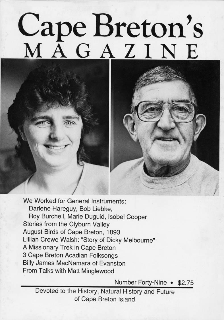 • Part One of a Two-Part Story: We Worked for General Instruments • Stories from the Clyburn Valley • August Birds of Cape Breton, 1893 • A Story from Lillian Crewe Walsh: Story of Dicky Melbourne • A Missionary Trek in Cape Breton • 3 Cape Breton Acadian Folksongs • Billy James MacNamara of Evanston • From Talks with Matt Minglewood