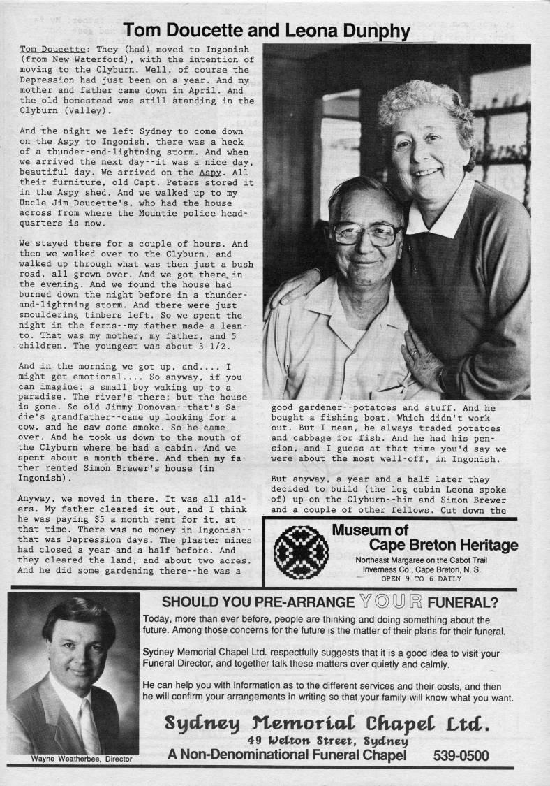 Published by Ronald Caplan on 1988/8/1 (376 reads)Tom Doucette and Leona Dunphy Tom Doucette: They (had) moved to Ingonish (from New Waterford), with the intention of moving to the Clyburn. Well, of course the Depression had just been on a year. And my mother and father came down in April. And the old homestead was still standing in the Clyburn (Valley). And "the night we left Sydney to come down on the Aspy to Ingonish, there was a heck of a thunder-and-lightning storm. And when we arrived the next day--it was a nice day, beautiful day. We arrived on the Aspy. All their furniture, old Capt. Peters stored it in the Aspy shed. And we walked up to my Uncle Jim Doucette's, who had the house across from where the Mountie police head? quarters is now. We stayed there for a couple of hours. And then we walked over to the Clyburn, and walked up through what was then just a bush road, all grown over. And we got there, in the evening. And we found the house had burned down the night before in a thunder- and-lightning storm. And there were just smouldering timbers left. So we spent the night in the ferns--my father made a lean- to. That was my mother, my father, and 5 . children. The youngest was about 3 1/2. And in the morning we got up, and.... I might get emotional.... So an3rway, if you can imagine: a small boy waking up to a paradise. The river's there; but the house is gone. So old Jimmy Donovan--that's Sa? die's grandfather--came up looking for a cow, and he saw some smoke. So he came over. And he took us down to the mouth of the Clyburn where he had a cabin. And we spent about a month there. And then my fa? ther rented Simon Brewer's house (in Ingonish). Anyway, we moved in there. It was all ald? ers. My father cleared it out, and I think he was paying $5 a month rent for it, at that time. There was no money in Ingonish-- that was Depression days. The plaster mines had closed a year and a half before. And they cleared the land, and about two acres. And he did some gardening there--he was a good gardener--potatoes and stuff. And he bought a fishing boat. Which didn't work out. But I mean, he always traded potatoes and cabbage for fish. And he had his pen? sion, and I guess at that time you'd say we were about the most well-off, in Ingonish. But anyway, a year and a half later they decided to build (the log cabin Leona spoke of) up on the Clyburn--him and Simon Brewer and a couple of other fellows. Cut down the Museum of Cape Breton Heritage Northeast Margaree on the Catxjt Trail Inverness Co., Cape Breton, N. 8. OPEN 9 TO 6 DAILY Wayne Weatherbee, Director SHOULD YOU PRE-ARRANGE • ?01 FUNERAL? Today, more than ever before, people are thinking and doing something about the future. Among those concerns for the future is the matter of their plans for their funeral. Sydney Memorial Chapel Ltd. respectfully suggests that it is a good idea to visit your Funeral Director, and together talk these matters over quietly and calmly. He can help you with information as to the different services and their costs, and then he will confirm your arrangements in writing so that your family will know what you want. St'cCnei' ?tetnoriat Chapel LtcC. 49 Weiton Street, St'cCnet' A Non-Denominational Funeral Chapel 539-0500