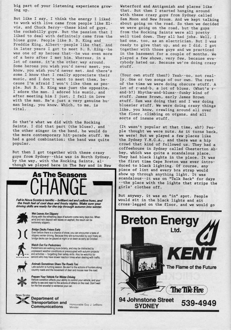 Published by Ronald Caplan on 1988/8/1 (317 reads)big part of your listening experience grow? ing up. But like I say, I think the energy I liked to work with live came from people like El? vis, and Chuck Berry--these kind of guys, the rockabilly guys. But the passion that I liked to deal with definitely came from the blues guys. People like B. B. King and Freddie King, Albert--people like that. And in later years I got to meet B. B. King--he was one of my heroes that--he was even more of a hero after I met him. Whereas, in a lot of cases, it's the other way around. Some heroes you wish you'd never meet, you know, you wish you'd never met. And there's some I know that I really appreciate their music, and I don't want to meet them, be? cause I'm afraid I won't like them as peo? ple. But B. B. King was just the opposite. I adore the man. I adored his music, and after meeting him I just, I fell in love with the man. He's just a very genuine hu? man being, you know. Which, to me, is vital. So that's what we did with the Rocking Saints. I did that part (the blues), and the other singer in the band, he would do the more contemporary hit-parade stuff. We had a good combination; the band was quite popular. But then I got together with these crazy guys from Sydney--this was in North Sydney, by the way, with the Rocking Saints, al? though we played here in The Bay and in New As The Seasons -CHANGE - Fall in Nova Scotia is terrific • brilliant red and yellow hues, and the fresh feel of cool days and frosty nights. Make sure your driving skills are ready for the trip through autumn into winter. )( d Wet Leaves Are Slippery Along with the refreshing days of autumn come rainy days too. When wind and rain deposit wet leaves on asphalt, the result can be extremely slippery, Bridge Decks Freeze Early Even before there is a chance of snow, you can encounter a taste of slippery winter driving. Because they are surrounded by cool frosty air, bridge decks can be glazed at night or at dawn as early as October. Watch Out For Pedestrians Pedestrians are walking more briskly, and may be distracted by unpleasant weather conditions or preoccupied with autumn projects and activities - forgetting their safety skills. Also be watchful for seniors who may have slower reaction times when dealing with traffic. Animals Sometimes Share The Roads Too Late autumn is hunting season. Be alert to the actions of hunters along country roads and the movement of deer and moose near the road. Prepare Your Vehicle For Winter Driving Vehicle condition affects your ability to control your vehicle, and your ability to see and react to the actions of others on the road. Don't wait for the first snowfall to winterize your car. Department of Transportation and honourable Guy J LeBlar'c Communications Minister Waterford and Antigonish and places like that. But then I started hanging around with these crazy guys from Sydney called Sam Moon and New Broom. And we kept talking about going on the road. So then we decided we were going on the road, but the guys from the Rocking Saints were all pretty well tied down. They all had jobs. Well, I had one, too, as an electrician. But I was ready to give that up, and so I did. I got together with those guys and we practiced in the basement for a couple of months. We played a few shows, very few, because eve? rybody hated us. Because we're doing crazy stuff. (Your own stuff then?) Yeah--no, not real? ly. One or two songs of our own. The rest of the time we were doing obscure stuff. A lot of r-and-b, a lot of blues. (What's r- and-b?) Rhythm-and-blues--funky kind of stuff. James Brown, early James Brown stuff. Sam was doing that and I was doing bluesier stuff. We were doing crazy things like, you know, crawling around all over the floor, climbing on organs, and all sorts of insane stuff. (It wasn't popular at that time, eh?) Peo? ple thought we were nuts. As it turns back, we were! But we played a few places like the Sydney Y.M.C.A., and there was a hip crowd that kind of followed us. They had a coffeehouse in Sydney called Chesterton Ab? bey, which was quite a scandalous place. They had black lights in the place. It was the first time Cape Breton was ever intro? duced to black lighting. Of course, any piece of lint and every bra strap would show up through anything light. It was scandalous--it was on "Talk Back" for days --the place with the lights that strips the girls' clothes off. But an3rway, it was an "in" spot. People would sit in the black lights and sit cross-legged on the floor, and we would go Breton Energy Ltd. 94 Johnstone Street SYDNEY 539-4949