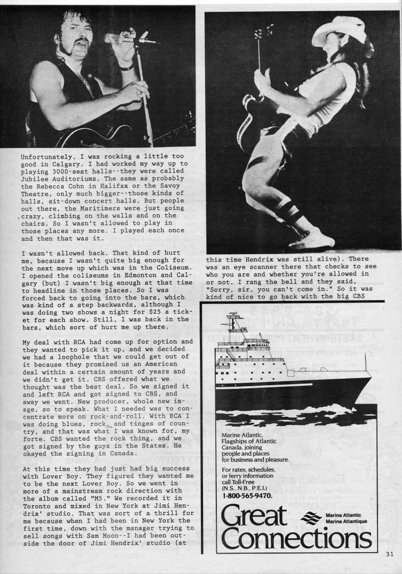Published by Ronald Caplan on 1988/8/1 (287 reads)Unfortunately, I was rocking a little too good in Calgary. I had worked my way up to playing 3000-seat halls--they were called Jubilee Auditoriums. The same as probably the Rebecca Cohn in Halifax or the Savoy Theatre, only much bigger--those kinds of halls, sit-down concert halls. But people out there, the Maritimers were just going ,crazy, climbing on the walls and on the chairs. So I wasn't allowed to play in those places any more. I played each once and then that was it. I wasn't allowed back. That kind of hurt me, because I wasn't quite big enough for the next move up which was in the Coliseum. I opened the coliseums in Edmonton and Cal? gary (but) I wasn't big enough at that time to headline in those places. So I was forced back to going into the bars, which was kind of a step backwards, although I was doing two shows a night for $25 a tick? et for each show. Still, I was back in the bars, which sort of hurt me up there. My deal with RCA had come up for option and they wanted to pick it up, and we decided we had a loophole that we could get out of it because they promised us an American deal within a certain amount of years and we didn't get it. CBS offered what we thought was the best deal. So we signed it and left RCA and got signed to CBS, and away we went. New producer, whole new im? age, so to speak. What I needed was to con? centrate more on rock-and-roll. With RCA' I was doing blues, rock, and tinges of coun? try, and that was what I was known for, my forte. CBS wanted the rock thing, and we got signed by the guys in the States. He okayed the signing in Canada. At this time they had just had big success with Lover Boy. They figured they wanted me to be the next Lover Boy. So we went in more of a mainstream rock direction with the album called "M5." We recorded it in Toronto and mixed in New York at Jimi Hen- drix' studio. That was sort of a thrill for me because when I had been in New York the first time, down with the manager trying to sell songs with Sam Moon--I had been out? side the door of Jimi Hendrix' studio (at this time Hendrix was still alive). There was an eye scanner there that checks to see who you are and whether you're allowed in or not. I rang the bell and they said, "Sorry, sir, you can't come in." So it was kind of nice to go back with the big CBS Marine Atlantic, Flagships of Atlantic Canada, joining people and places for business and pleasure. For rates, schedules, or ferry information call Toil-Free (N.S., N.B., P:E.I.) 1-800-565'470. Great Marine Atlantic Marine Atlantique (jonnections