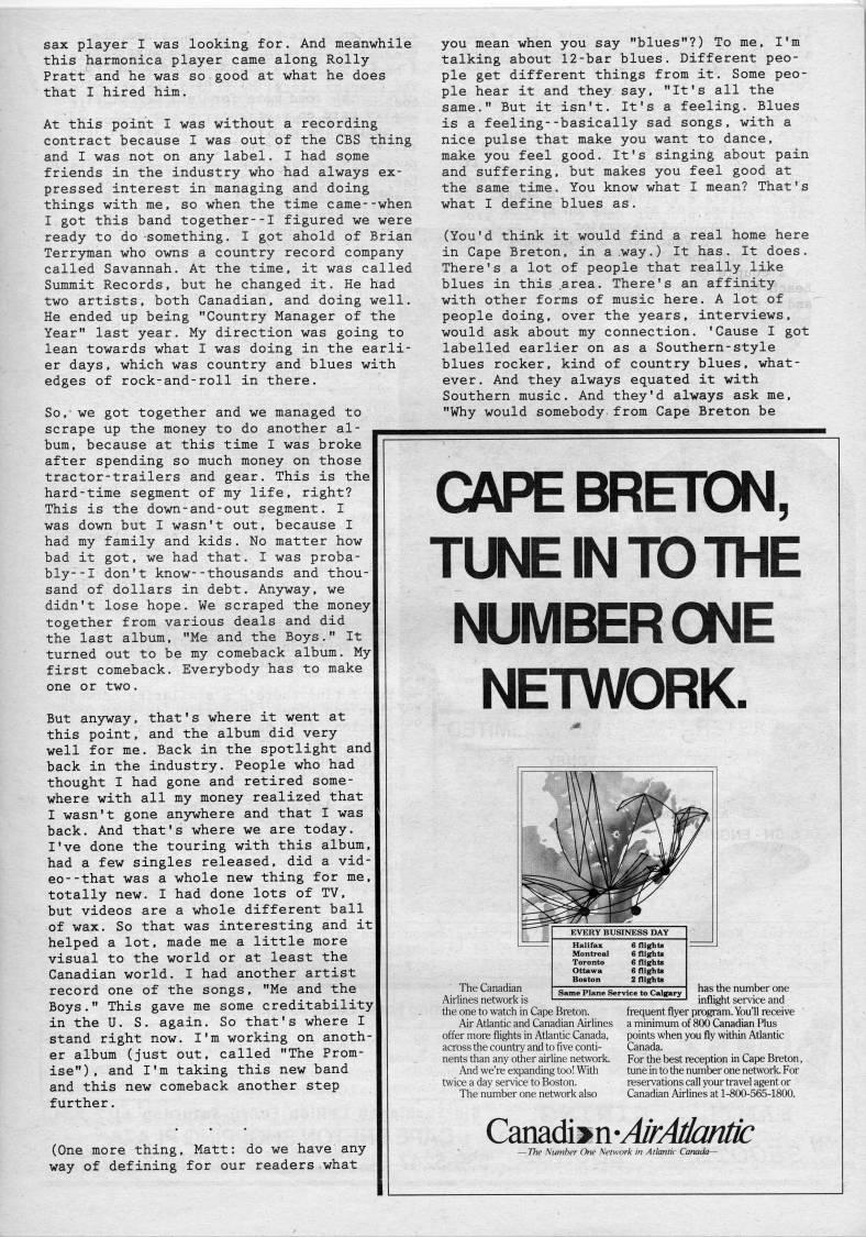 Published by Ronald Caplan on 1988/8/1 (311 reads)sax player I was looking for. And meanwhile this harmonica player came along Roily Pratt and he was so good at what he does that I hired him. At this point I was without a recording contract because I was out of the CBS thing and I was not on any label. I had some friends in the industry who had always ex? pressed interest in managing and doing things with me, so when the time came--when I got this band together--I figured we were ready to do -something. I got ahold of Brian Terryman who owns a country record company called Savannah. At the time, it was called Summit Records, but he changed it. He had two artists, both Canadian, and doing well. He ended up being "Country Manager of the Year" last year. My direction was going to lean towards what I was doing in the earli? er days, which was country and blues with edges of rock-and-roll in there. So, we got together and we managed to scrape up the money to do another al? bum, because at this time I was broke after spending so much money on those tractor-trailers and gear. This is the hard-time segment of my life, right? This is the down-and-out segment. I was down but I wasn't out, because I had my family and kids. No matter how bad it got, we had that. I was proba? bly- -I don't know--thousands and thou? sand of dollars in debt. Anyway, we didn't lose hope. We scraped the money together from various deals and did the last album, "Me and the Boys." It turned out to be my comeback album. My first comeback. Everybody has to make one or two. But anyway, that's where it went at this point, and the album did very well for me. Back in the spotlight and back in the industry. People who had thought I had gone and retired some? where with all my money realized that I wasn't gone anjrwhere and that I was back. And that's where we are today. I've done the touring with this album, had a few singles released, did a vid? eo- -that was a whole new thing for me, totally new. I had done lots of TV, but videos are a whole different ball of wax. So that was interesting and it helped a lot, made me a little more visual to the world or at least the Canadian world. I had another artist record one of the songs, "Me and the Boys." This gave me some creditability in the U. S. again. So that's where I stand right now. I'm working on anoth er album (just out, called "The Prom? ise"), and I'm taking this new band and this new comeback another step further. (One more thing. Matt: do we have any way of defining for our readers what you mean when you say "blues"?) To me, I'm talking about 12-bar blues. Different peo? ple get different things from it. Some peo? ple hear it and they say, "It's all the same." But it isn't. It's a feeling. Blues is a feeling--basically sad songs, with a nice pulse that make you want to dance, make you feel good. It's singing about pain and suffering, but makes you feel good at the same time. You know what I mean? That's what I define blues as. (You'd think it would find a real home here in Cape Breton, in a .way.) It has. It does. There's a lot of people that really like blues in this .area. There's an affinity with other forms of music here. A lot of people doing, over the years, interviews, would ask about my connection. 'Cause I got labelled earlier on as a Southern-style blues rocker, kind of country blues, what? ever. And they always equated it with Southern music. And they'd always ask me, "Why would somebody from Cape Breton be CAPE BRETON, TUNE IN TO THE NUMBER ONE NETWORK. The Canadian Airlines network is the one to watch in Cape Breton. EVERY BUSINESS DAY ] Halifax Montreal Toronto Boston 6 flights 6 flights 6 flights 6 flights 2 flights Same Plane Service to Calgary | has the number one inflight service and frequent flyer program. You'l Air Atlantic and Canadian Airlines a minimum of 800 Canadian Plus offer more flights in Atlantic Canada, across the country and to five conti? nents than any other airline network. And we're expanding too! With twice a day service to Boston. The number one network also points when you fly within Atlantic Canada. For the best reception in Cape Breton, tune in to the number one network. For reservations call your travel agent or Canadian Airlines at 1-800-565-1800. Csaadiyn-A/rA/hnft • The Number One Network in A llanlic Canada •