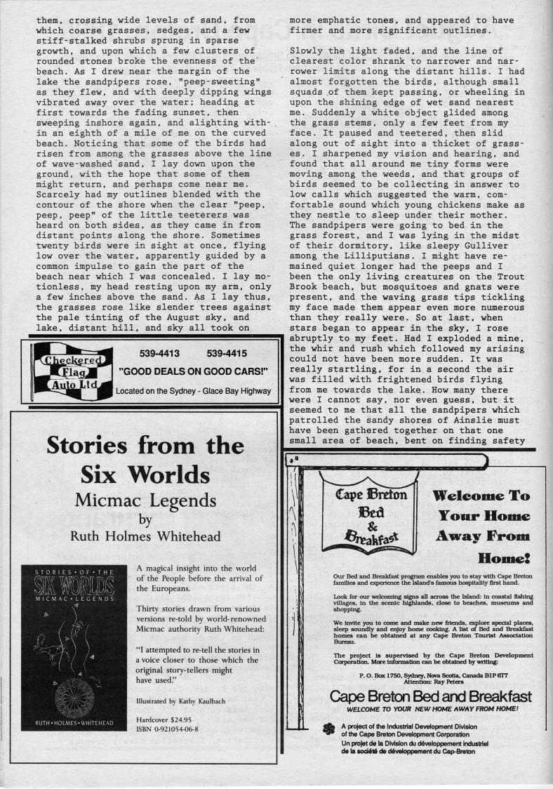 Published by Ronald Caplan on 1988/8/1 (248 reads)them, crossing wide levels of sand, from which coarse grasses, sedges, and a few stiff-stalked shrubs sprung in sparse growth, and upon which a few clusters of rounded stones broke the evenness of the' beach. As I drew near the margin of the lake the sandpipers rose, "peep-sweeting" as they flew, and with deeply dipping wings vibrated away over the water; heading at first towards the fading sunset, then sweeping inshore again, and alighting with? in an eighth of a mile of me on the curved beach. Noticing that some of the birds had risen from among the grasses above the line of wave-washed sand, I lay down upon the ground, with the hope that some of them might return, and perhaps come near me. Scarcely had my outlines blended with the contour of the shore when the clear "peep, peep, peep" of the little teeterers was heard on both sides, as they came in from distant points along the shore. Sometimes twenty birds were in sight at once, flying low over the water, apparently guided by a common impulse to gain the part of the beach near which I was concealed. I lay mo? tionless, my head resting upon my arm, only a few inches above the sand. As I lay thus, the grasses rose like slender trees against the pale tinting of the August sky, and lake, distant hill, and sky all took on 539-4413 539-4415 "GOOD DEALS ON GOOD CARS!" Located on the Sydney - Glace Bay Highway Stories Six Micmj Ruth Hoi from the Worlds ic Legends by mes Whitehead A magical insight into the world of the People before the arrival of the Europeans. Thirty stories drawn from various versions re-told by world-renowned Micmac authority Ruth Whitehead: "I attempted to re-tell the stories in a voice closer to those which the original story-tellers might have used." Illustrated by Kathy Kaulbach Hardcover $24.95 ISBN 0-921054-06-8 more emphatic tones, and appeared to have firmer and more significant outlines. Slowly the light faded, and the line of clearest color shrank to narrower and nar? rower limits along the distant hills. I had almost forgotten the birds, although small squads .of them kept passing, or wheeling in upon the shining edge of wet sand nearest me. Suddenly a white object glided among the grass stems, only a few feet from my face. It paused and teetered, then slid along out of sight into a thicket of grass? es. I sharpened my vision and hearing, and found that all around me tiny forms were moving among the weeds, and that groups of birds seemed to be collecting in answer to low calls which suggested the warm, com? fortable sound which young chickens make as they nestle to sleep under their mother. The sandpipers were going to bed in the grass forest, and I was lying in the midst of their dormitory, like sleepy Gulliver among the Lilliputians. I might have re? mained quiet longer had the peeps and I been the only living creatures on the Trout Brook beach, but mosquitoes and gnats were present, and the waving grass tips tickling my face made them appear even more numerous than they really were. So at last, when stars began to appear in the sky, I rose abruptly to my feet. Had I exploded a mine, the whir and rush which followed my arising could not have been more sudden. It was really startling, for in a second the air was filled with frightened birds flying from me towards the lake. How many there were I cannot say, nor even guess, but it seemed to me that all the sandpipers which patrolled the sandy shores of Ainslie must have been gathered together on that one small area of beach, bent on finding safety Cape Breton Bed Welcome To Your Home A'nray Fromi HomeS Our Bed and Breakfast program enables you to stay with Cape Breton families and e}q>erience the Island's famous hospitality first hand. Look for our welcoming signs all across the Island: in coastal fishing villages, in the scenic highlands, dose to beaches, museums and shopping. We Invite you to come and make new blends, explore special places, sleep soundly and enjoy home cooking. A list of Bed and Breakfast homes can be obtained at any Cape Breton Tourist Associatian Cape Breton Bed and Breakfast WELCOME TO YOUR NEW HOME AWAY FROM HOME! ??A project of the Industrial Development Division of the Cape Breton Development Corporation Un projet de la Division du ddveloppement industriel de la soddtft de developpement du Cap-Breton