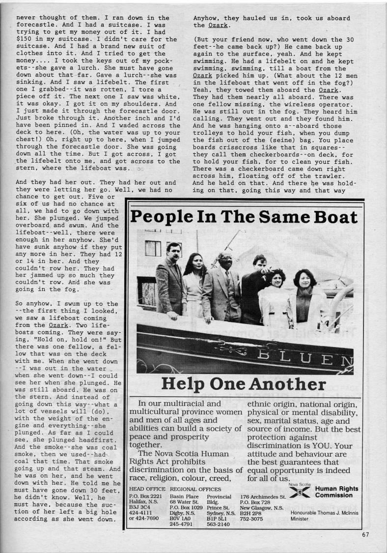 Published by Ronald Caplan on 1988/8/1 (208 reads)never thought of them. I ran down in the forecastle. And I had a suitcase. I was trying to get my money out of it. I had $150 in my suitcase. I didn't care for the suitcase. And I had a brand new suit of clothes into it. And I tried to get the money.... I took the keys out of my pock? ets- -she gave a lurch. She must have gone down about that far. Gave a lurch--she was sinking. And I saw a lifebelt. The first one I grabbed--it was rotten, I tore a piece off it. The next one I saw was white, it was okay. I got it on my shoulders. And I just made it through the forecastle door. Just broke through it. Another inch and I'd have been pinned in. And I waded across the deck to here. (Oh, the water was up to your chest!) Oh, right up to here, when I jumped through the forecastle door. She was going down all the time. But I got across. I got the lifebelt onto me, and got across to the stern, where the lifeboat was. And they had her out. They had her out and they were letting her go. Well, we had no chance to get out. Five or six of us had no chance at all, we had to go down with her. She plunged. We jumped overboard and swum. And the lifeboat--well, there were enough in her anyhow. She'd have sunk anyhow if they put any more in her. They had 12 or 14 in her. And they couldn't row her. They had her jammed up so much they couldn't row. And she was going in the fog. So anyhow, I swum up to the --the first thing I looked, we saw a lifeboat coming from the Ozark. Two life? boats coming. They were say? ing, "Hold on, hold on!" But there was one fellow, a fel? low that was on the deck with me. When she went down --I was out in the water when she went down--I could see her when she plunged. He was still aboard. He was on the stern. And instead of going down this way--what a lot of vessels will (do), with the weight of the en? gine and everything--she plunged. As far as I could see, she plunged headfirst. And the smoke--she was coal smoke, then we used--had coal that time. That smoke going up and that steam. And he was on her, and he went down with her. He told me he must have gone down 30 feet, he didn't know. Well, he must have, because the suc? tion of her left a big hole according as she went down. Anyhow, they hauled us in, took us aboard the Ozark. (But your friend now, who went down the 30 feet--he came back up?) He came back up again to the surface, yeah. And he kept swimming. He had a lifebelt on and he kept swimming, swimming, till a boat from the Ozark picked him up. (What about the 12 men in the lifeboat that went off in the fog?) Yeah, they towed them aboard the Ozark. They had them nearly all aboard. There was one fellow missing, the wireless operator. He was still out in the fog. They heard him calling. They went out and they found him. And he was hanging onto a--aboard those trolleys to hold your fish, when you dump the fish out of the (seine) bag. You place boards crisscross like that in squares-- they call them checkerboards--on deck, for to hold your fish, for to clean your fish. There was a checkerboard came down right across him, floating off of the trawler. And he held on that. And there he was hold? ing on that, going this way and that way People In The Same Boat Help One Another In our multiracial and ethnic origin, national origin, multicultural province women physical or mental disability, and men of all ages and sex, marital status, age and abilities can build a society of source of income. But the best peace and prosperity protection against together. discrimination is YOU. Your The Nova Scotia Human attitude and behaviour are Rights Act prohibits the best guarantees that discrimination on the basis of equal opportunity is indeed race, religion, colour, creed, for all of us. HEAD OFFICE REGIONAL OFFICES P.O. Box 2221 Basin Place Provincial 176 Archimedes St. Halifax, N.S. 68 Water St. BIdg. P.O. Box 728 B3J3C4 P.O. Box 1029 Prince St. New Glasgow. N.S. 424-4111 Digby, N.S. Sydney, N.S. B2H 2P8 or 424-7690 BOY lAO BIP 5L1 752-3075 245-4791 563-2140 >c Human Rights Commission Honourable Thomas J. Mclnnis Minister 67