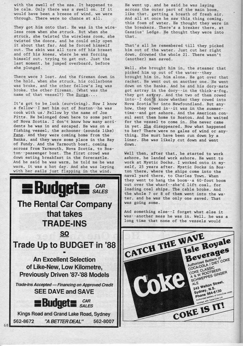 Published by Ronald Caplan on 1988/8/1 (217 reads)with the swell of the sea. It happened to be calm. Only there was a swell on. If it would have been a breeze of wind, we were through. There were no chance at all. They got him onto that. He was in the wire? less room when she struck. But when she struck, she twisted the wireless room, she twisted the doors, and he could only open it about that far. And he forced himself out. The skin was all tore off his breast and off his knees, where he was forcing himself out, trying to get out. Just the last moment, he jumped overboard, before she plunged. There were 3 lost. And the fireman down in the hold, when she struck, his collarbone was broke, and the other fellow's leg was broke, the other fireman. (What was the name of that vessel?) The Surge.... It's got to be luck (surviving). Now I know a fellow--I met him out of Boston--he was cook with us. Fellow by the name of Joe Pitts. He belonged down here to some part of Nova Scotia. I don't know how many acci? dents he was in and escaped. He was on a fishing vessel, the schooner (sounds like) Fane. And they were coming home from the Banks, and they were some place in the Bay of Fundy. And the Yarmouth boat, coming across from Yarmouth, Nova Scotia, to Bos? ton- -passenger boat. The first crowd was down eating breakfast in the forecastle. And he said he was warm, he told me he was warm, it was a hot day. And she was laying with her sails just flapping in the wind. sBudgjBts CAR SALES The Rental Car Company that takes TRADE-INS so Trade Up to BUDGET in '88 An Excellent Selection of Like-New, Low Kilometre, Previously Driven '87-*88 Models Trade-Ins Accepted • Financing on Approved Credit SEE DAVE and SAVE sBiidg.eta CAR SALES Kings Road and Grand Lake Road, Sydney 562-8672 "A BETTER DEAL" 562-8007 He went up, and he said he was laying across the outer part of the main boom, like that, getting a breath of fresh air. And all at once he saw this thing coming, this foam of water. He thought they were in the breakers. There's a breaker there, at Cassius' Ledge. He thought they were into that. That's all he remembered till they picked him out of the water. Just cut her right down, drowned the whole 21. There wasn't (another) man saved. Well, she brought him in, the steamer that picked him up out of the water--they brought him in, him alone. He got over that racket. He went out on another one. He went down on the Banks. And he and his dory-mate got astray in the dory--in the thick-a-fog, they got astray. And the two of them rowed into--I don't know whether they rowed into Nova Scotia or into Newfoundland. But any? how, they rowed in--it was in the summer? time- -and got ashore. And the American con? sul sent them home to Boston. And he waited for the vessel to come in. She never came in yet. She disappeared. Now what happened to her? There were no gales of wind or any? thing. She must have been run down by a liner. She was likely cut down and went down. Well then, after that, he started to work ashore, he landed work ashore. He went to work at Mystic Docks. I worked onto it my? self, 25 years after. Mystic Docks in Bos? ton there, where the ships come into the naval yard there, to Charles Town. When they went to hang the boom--a 60-foot boom out over the wharf--she'd lift coal, for loading coal ships. The cable broke. And the whole 7 or 8 of them went into the wa? ter, and he was the only one saved. That was going some. And something else--I forget what else it was--another mess he was in. Well, he was a long time that none of the vessels would