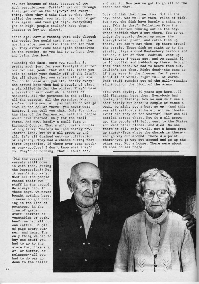 No, not because of that, because of too much restrictions. Cattle'd get out through that, get out on the highways and every? thing. Then they'd take them to what they called the pound; you had to pay for to get them again. And feed got high. Everything got so high, people couldn't keep them. Cheaper to buy it, almost. Years ago, cattle roaming were only through the woods. You could turn them out in the morning after you milked them and let them go. They either came back again themselves in the evening, or you had to go hunt them and bring them back. (Running the farm, were you running it pretty much just for your family?) Just for our own use, yeah, that was all. (Were you able to raise your family off of the farm?) Not all alone, but you raised all you ate. You could raise all you ate. Nearly every? one around here then had a couple of pigs, a pig killed in for the winter. They'd have a barrel of salt codfish, a barrel of mackerel, all the potatoes in the cellar, all the carrots, all the parsnips. What you're buying now, all you had to do was go down in the cellar there--you never were hungry, I can tell you that. Only for that, the time of the Depression, half the people would have starved. Only for the small farms. And now, hardly a small farm on Richmond County. That's, all, just a couple of big farms. There's no land hardly now. There's land, but it's all grown up and all. It's all drained out--no cultivation or anything. They had a chance during that first Depression. If there ever come anoth? er one--goodbye! I don't know what they'd do. They'd do nothing, that I could see. and get it. Now you've got to go all to the store for that. Lots of fish that time, too. Out in the bay, here, was full of them. Piles of fish. But now, the fish have barely a thing to eat. (Why is that?) Pollution from the mill, pollution running out in the bay. Those codfish that's out there. You go up under the strait there, up under the (heavy) water plant, and catch fish up there. You can't eat them. Up there around the strait. Those fish go right up to the strait, plays around Hawkesbury harbour and around, a lot of them, codfish. Went up there about 3 years ago, and we caught 10 or 15 codfish and haddock up there. Brought them home here, we had to heave them out. Couldn't eat them. Right dead--the same as if they were in the freezer for 2 years. And full of worms, right full of worms. That stuff running out of the mill--running right out on the floor of the ocean. (You were saying, 80 years ago here...?) All fishermen here then. Everybody had boats, and fishing. Now we wouldn't see a boat hardly out here--a couple of times a week, we might see a boat go up. (And this was all sailboats in here.) All sailboats. (What did they do for wharfs?) That was all settled across there. Now it's all grown up, the people all left, went to the States and went other places, and died. No one there at all, only--well, not a house from up there--from where the church is there-- and go way out around--there's a point there--you go way out around and go up the other way. Not a house. Theire were about 20-some houses there. (Did the coastal vessels still come in with food, during the Depression?) No, it wasn't too many. Most all the people raised their own stuff in the ground. We always did. In those days, we never bought nothing here. I never bought noth? ing in the line of potatoes, in the line of garden stuff--carrots or vegetables or pork, beef--we had all our own cattle. Couple of pigs every sum? mer, and hens. The only thing we had to buy was stuff you had to go to the store for, like sug? ar, or butter, or molasses - - all you had to do was go down to the cellar