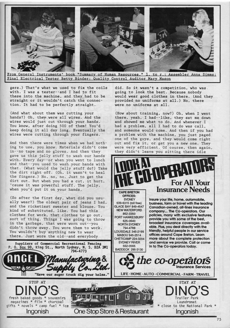 From General Instruments' book "Summary of Human Resources." 1. to r.; Assembler Anna Simms: Final Electrical Tester Betty Binder: Quaiitv Control Auditor Marv Mason gers.) That's what we used to fix the coils with. I was a tester--and I had to fit these into the machine, and they had to be straight or it wouldn't catch the connec? tion. It had to be perfectly straight. did. So it wasn't a competition, who was. going to look the best. Because nobody would wear good clothes in there. (And they provided no uniforms at all.) No, there were no uniforms at all. (And what about them was cutting your hands?) Oh, they were all wires. And the wires would just cut through your hands. You know, after doing 500 of them! You'd keep doing it all day long. Eventually the wires were cutting through your fingers. And then there were times when we had noth? ing to use, you know. Materials didn't come in--no tape and no gloves. And then they gave us this jelly stuff to wash our hands with. Every day--or when you went to lunch and that--you used to wash your hands with that. (What would the jelly stuff do?) Take the dirt right off. (Oh, it wasn't to heal the fingers.) No, no, no. Just to get the dirt out. But when you had a cut, it hurt, 'cause it was powerful stuff. The jelly, when you'd put it on your hands. (So after the first day, what did you usu? ally wear?) The oldest pair of jeans I had, and the ricketiest sweater and blouse. You kind of substituted, like. You had this clothes for work, that clothes to go out, sort of thing. Things I was going to throw in the garbage, that were worn out--you didn't throw away. You wore them to work. You wouldn't buy anything new to wear there. Just wore the old--and everybody Suppliers of Coioinerclal Recreational Fenciag P. 0. Box 98?? King St., North Sydney, N. S. B2A 3M1 794-4773 (How about training, now?) Oh, when I went there, yeah, I had--like, they sat me down and showed me what to do. And whenever I had a problem, all I had to do was call, and someone would come. And then if you had a problem with the machine, you just paged one of the guys, and they would come right out and fix it, or get you a new one. They were very efficient. Of course, then again, they didn't leave you sitting there idle 'Have our auger truck dig your holes." CAPE BRETON OFFICES: SYDNEY 539-6315 (toll free) GLACE BAY 849-4547 NEW WATERFORD 862-3350 PORT HAWKESBURY 625-0640 NORTH SYDNEY 794-4788 LOUISDALE 345-2199 MABOU 945-2514 CHETICAMP 224-3204 SYDNEY RIVER 562-0565 BADDECK 295-3130 For All Your Insurance Needs Insure your life. home, automobile, business, farm or travel with ttie leading Canadian-owned, all-lines insurance company... Ttie Co-operators. Our policies, many witti exclusive features, provide you witti some of ttie best, broodest insurance coverages avail? able. Plus, you deal directly witti the friendly, helpful people in our service offices around Cape Breton. Leam more about the complete protection and service we provide. Call or come in to The Co-operators today. oS the co-opethto' 'O Insurance Services LIFE • HOME • AUTO • COMMERCIAL • FARM • TRAVEL DI NO'S fresh baked goods * souvenirs magazines * film * charcoal gifts * novels * camp fuel * ice Ingonish STAY AT DING'S Trailer Park Laundromat ' * close to the National Park One Stop Store & Restaurant Ingonish 75