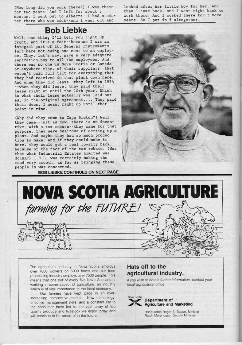 (How long did you work there?) I was there for two years. And I left for about 8 months. I went out to Alberta--I had a sis? ter there who was sick--and I went out and looked after her little boy for her. And then I??came back, and I went right back to work there. And I worked there for 3 more years. So I put in 5 altogether. Bob Liebke Well, one thing I'll tell you right up front, and it's a fact--because I was an integral part of it. General Instruments left here not owing one cent to an employ? ee. They, let's say, gave a very adequate separation pay to all the employees. And there was no one in Nova Scotia or Canada or anywhere else, of their suppliers, that weren't paid full tilt for everything that they had received in that plant down here. And when they did leave--they left in 1974 --when they did leave, they paid their lease right up until the 10th year. Which is what their lease actually was laid out as, in the original agreement.... They paid their dues, I mean, right up until that point in time. (Why did they come to Cape Breton?) Well they came--just as now, there is an incen? tive, with a tax rebate--they came for that purpose. They were desirous of setting up a plant. And maybe they had so much produc? tion to make. And if they could make it here, they would get a real royalty back, because of the fact of the tax rebate. (Was that what Industrial Estates Limited was doing?) I.E.L. was certainly making the road very smooth, as far as bringing these people in was concerned. BOB LIEBKE CONTINUES ON NEXT PAGE NOVA SCOTIA AGRICUITURE faming for the fl/ITI/IK'> ??''"' *v'.o' 7/~f/-1 r- '.f-r Mr 71T 'Jj;'jL' The agricultural industry in Nova Scotia employs over 7000 workers on 5000 farms and our food processing industry employs over 7500 people. This means that one out of every five Nova Scotians is working in some aspect of agriculture, an industry which is of vital importance to the local economy. Our farmers have kept pace in an ever- increasing competitive market. New technology, effective management skills, and a constant ear to the consumer have led to the vast array of top quality produce and livestock we enjoy today and will continue to be proud of in the future. Hats off to the agricultural industry. // you wish to obtain further information, contact your local agricultural office. Department of Agriculture and Marketing Honourable Roger S. Bacon, Minister Ralph Morehouse, Deputy Minister