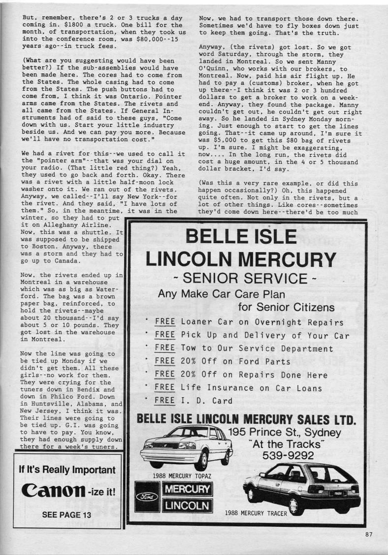 But, remember, there's 2 or 3 trucks a day coming in. $1800 a truck. One bill for the month, of transportation, when they took us into the conference room, was $80,000--15 years ago--in truck fees. (What are you suggesting would have been better?) If the sub-assemblies would have been made here. The cores had to come from the States. The whole casing had to come from the States. The push buttons had to come from, I think it was Ontario. Pointer arms came from the States. The rivets and all came from the States. If General In? struments had of said to these guys, "Come down with us. Start your little industry beside us. And we can pay you more. Because we'll have no transportation cost." We had a rivet for this--we used to call it the "pointer arm"--that was your dial on your radio. (That little red thing?) Yeah, they used to go back and forth. Okay. There was a rivet with a little half-moon lock washer onto it. We ran out of the rivets. Anyway, we called--I'11 say New York--for the rivet. And they said, "I have lots of them." So, in the meantime, it was in the winter, so they had to put it on Alleghany Airline. Now, this was a shuttle. It was supposed to be shipped to Boston. Anyway, there was a storm and they had to go up to Canada. Now, we had to transport those down there. Sometimes we'd have to fly boxes down just to keep them going. That's the truth. Anyway, (the rivets) got lost. So we got word Saturday, through the storm, they landed in Montreal. So we sent Manny O'Quinn, who works with our brokers, to Montreal. Now, paid his air flight up. He had to pay a (customs) broker, when he got up there--I think it was 2 or 3 hundred dollars to get a broker to work on a week? end. Anyway, they found the package. Manny couldn't get out, he couldn't get out right away. So he landed in Sydney Monday morn? ing. Just enough to start to get the lines going. That--it came up around, I'm sure it was $5,000 to get this $80 bag of rivets up. I'm sure. I might be exaggerating, now.... In the long run, the rivets did cost a huge amount, in the 4 or 5 thousand dollar bracket, I'd say. (Was this a very rare example, or did this happen occasionally?) Oh, this happened quite often. Not only in the rivets, but a lot of other things. Like cores--sometimes they'd come down here--there'd be too much Now, the rivets ended up in Montreal in a warehouse which was as big as Water? ford. The bag was a brown paper bag, reinforced, to hold the rivets--maybe about 20 thousand--I'd say about 5 or 10 pounds. They got lost in the warehouse in Montreal. Now the line was going to be tied up Monday if we didn't get them. All these girls--no work for them. They were crying for the tuners down in Bendix and down in Philco Ford. Down in Huntsville, Alabama, and New Jersey, I think it was. Their lines were going to be tied up. G.I. was going to have to pay. You know, they had enough supply down there for a week's tuners If It's Really Important Canon ize it! SEE PAGE 13 BELLE ISLE LINCOLN MERCURY -SENIOR SERVICE ~ Any Make Car Care Plan for Senior Citizens * FREE Leaner Car on Overnight Repairs * FREE Pick Up and Delivery of Your Car • FREE Tow to Our Service Department • FREE 20% Off on Ford Parts • FREE 20% Off on Repairs Done Here * FREE Life Insurance on Car Loans : FREE I. D. Card BELLE ISLE LINCOLN MERCURY SALES LTD. 195 Prince St., Sydney 'At the Tracks" 539-9292 1988 MERCURY TOPAZ MERCURY UNCOLN 1988 MERCURY TRACER