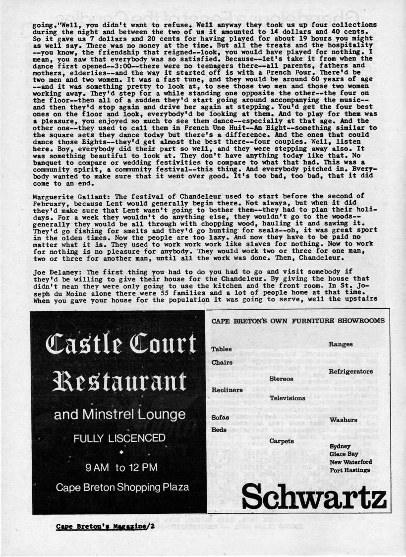 Published by Ronald Caplan on 1975/3/31 (796 reads)going."Well, you didn't want to refuse. Well anyway they took us up four collections during the night and between the two of us it amounted to 14 dollars and 40 cents. So it gave us 7 dollars and 20 cents for having played for about 19 hours you mi'ht as well say. There was no money at the time. But all the treats and the hospitality • you know, the friendship that reigned • look, you would have played for nothing. I mean, you saw that everybody was so satisfied. Because • let's take it from when the dance first opened • 3:00 • there were no teenagers there • all parents, fathers and mothers, elderlies • and the way it started off is with a French Four. There'd be two men and two women. It was a fast tune, and they would be around 60 years of age • and it was something pretty to look at, to see those two men and those two women working away. They'd step for a while standing one opposite the other • the four on the floor • then all of a sudden they'd start going around accompanying the music • and then they'd stop again and drive her again at stepping. You'd get the four best ones on the floor and look, everybody'd be looking at them. And to play for them was a pleasure, you enjoyed so much to see them dance • especially at that age. And the other one • they used to call them in French Une Huit • An Eight • something similar to the square sets they dance today but there's a difference. And the ones that could dance those Eights • they'd get almost the best there • four couples. Well, listen here. Boy, everybody did their part so well, and they were stepping away also. It was something beautiful to look at. They don't have anything today like that. No banquet to compare or wedding festivities to compare to what that had. This was a community spirit, a community festival • this thing. And everybody pitched in. Every? body wanted to make sure that it went over good. It's too bad, too bad, that it did come to an end. Marguerite Gallant: The festival of Chandeleur used to start before the second of February, because Lent would generally begin there. Not always, but when it did they'd make sure that Lent wasn't going to bother them • they had to plan their holi? days. For a week they wouldn't do anything else, they wouldn't go to the woods • generally they would be all through with chopping wood, hauling it and sawing it. They'd go fishing for smelts and they'd go hunting for seals • oh, it was great sport in the olden times. Now the people are too lazy. And now they have to be paid no matter what it is. They used to work work work like slaves for nothing. Now to work for nothing is no pleasure for anybody. They would work two or three for one man, two or three for another man, until all the work was done. Then, Chandeleur. Joe Delaney: The first thing you had to do you had to go and visit somebody if they'd be willing to give their house for the Chandeleur. By giving the house that didn't mean they were only going to use the kitchen and the front room' In St. Jo? seph du Moine alone there were 55 families and a lot of people home at that time.' When you gave your house for the population it was going to serve, well the upstairs Casittt Court 3Resitaurant and Minstrel Lounge FULLY LISCENCED 9 AM to 12 PM Cape Breton Shopping Plaza CAPE BBETONfe OWN FURNITUBE SHOWEOOMS Tables '"' Chairs Refrigerators Stereos Recliners Televisions ?*??'*? Washers Beds Carpets Sydney Gl • tceBay New Waterford Port Hastings Schwartz C??pe Breton*! M>ga??ine/2