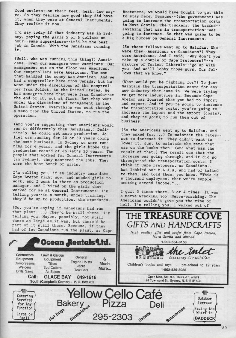 food outlets: on their feet, heat, low wag? es. So they realize how good they did have it, when they were at General Instruments. They realize it now. I'd say today if that industry was in Syd? ney, paying the girls 5 or 6 dollars an hour--same supervisors--it'd be the best job in Canada. With the Canadians running it. (Well, who was running this thing?) Ameri? cans . Even our managers were Americans. Our management out on the floor was American. Our comptrollers were Americans. The man that handled the money was American. And we had a comptroller here from Canada, but he went under the directions of the comptrol? ler from Joliet, in the United States. We had managers here that were from Canada--at the end of it, not at first. But they went under the directions of management in the United States. Everything was sent through a memo from the United States, to run the operation. (And you're suggesting that Americans would run it differently than Canadians.) Defi? nitely. We could get more production. Jo? liet was running for 20 or 30 years doing the same business. In Sydney we were run? ning for 4 years, and the girls broke the production record of Joliet's 20 years. The people that worked for General Instruments (in Sydney), they mastered the jobs. They were the best bunch of girls. I'm telling you, if an industry came into Cape Breton right now, and needed girls to work, and I went in there as production manager, and I hired on the girls that worked for me at General Instruments--I'm telling you--in a month, under training, they'd be up to production, the standards. (So, you're saying if Canadians had run that plant ) They'd be still there. I'm telling you. Maybe, possibly, not still there as large as it was, but there'd be part of it still there. Because, if they had of let Canadians run the plant, as Cape 'Oceon Jtentalsitd. Contractors Lawn & Garden Equipment Equipment Compressors Tillers Welders Sod Cutters Drills, Saws Air Eators General Engine Hoists Jacks Tow Bars & Much More... Call: GLACE BAY 849-1616 South (Campbelis Corner) - P. O. Box 265 Bretoners, we would have fought to get this to stay here. Because--(the government) was going to increase the transportation costs in Nova Scotia. The truckers, the trains-- anything that was in transportation--was going to increase. So that was going to be a big burden on General Instruments. (So these fellows went up to Halifax. Who were they--Americans or Canadians?) They were Americans. And I said, "Why don't you take up a couple of Cape Bretoners?"--a mixture of Tories, Liberals--"go up with you. And we'll lobby those guys. Our fel? lows that we know." (What would you be fighting for?) To just maintain the transportation costs for any new industry that came in. We were trying to get more industries in. Because Cape Breton was located that you had to import and export. And if you're going to increase the transportation costs, you're going to increase the import and the export (costs), and they're going to run them out of business. (So the Americans went up to Halifax. And they asked for....) To maintain the rates-- not to increase it. They didn't want to lower it. Just to maintain the rate that was on the books then. (And what was the result of that.) The result was that the increase was going through, and it did go through--of the transportation costs. I think if Cape Bretoners, as Canadians... had lobbied our M.L.A.s, and had of talked to them, and told them, you know, "This is a thousand employees, that we're supple? menting second income."... I quit 3 times there, 3 or 4 times. It was a nerve-wracking job. Nerve-wracking. The Americans wouldn't give you the time of hell. I'm telling you, I walked out of THE TREASURE COVE GIFTS AND HANDCRAFTS High quality gifts and crafts from Cape Breton, Nova Scotia and abroad 1-902-564-8158 '_' Children's books and toys - pre-school to 12 years 1-902-539-3035 Open Mon.-Sat. 9-6, Thurs.-Fri. until 9 74 Townsend St., Sydney, N. S. B1P 5C8 Yellow Cello Cafe Bakery '' Pizza Deli rSS' 295-2303 > >* '' Outdoor J Terrace I iFacing the! Wharf in > (baddeck)