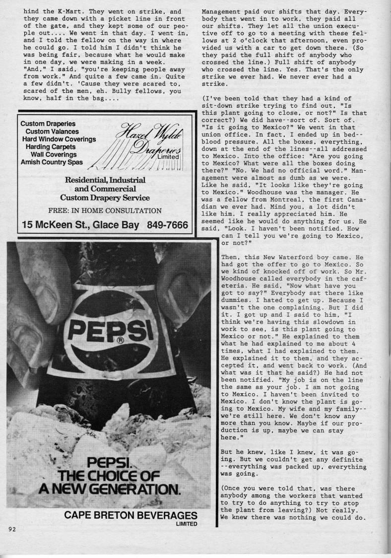 hind the K-Mart. They went on strike, and they came down with a picket line in front of the gate, and they kept some of our peo? ple out.... We went in that day. I went in, and I told the fellow on the way in where he could go. I told him I didn't think he was being fair, because what he would make in one day, we were making in a week. "And," I said, "you're keeping people away from work." And quite a few came in. Quite a few didn't. 'Cause they were scared to, scared of the men, eh. Bully fellows, you know, half in the bag.... Custom Draperies Custom Valances Hard Window Coverings Harding Carpets Wail Coverings Amish Country Spas Residential, Industrial and Commercial Custom Drapery Service FREE: IN HOME CONSULTATION 15 McKeen St., Glace Bay 849-7666 ''" pepsi... ThECHorceoF AN • W(i • Ne'ATION. CAPE BRETON BEVERAGES LIMITED Management paid our shifts that day. Every? body that went in to work, they paid all our shifts. They let all the union execu? tive off to go to a meeting with these fel? lows at 2 o'clock that afternoon, even pro? vided us with a car to get down there. (So they paid the full shift of anybody who crossed the line.) Full shift of anybody who crossed the line. Yes. That's the only strike we ever had. We never ever had a strike. (I've been told that they had a kind of sit-down strike trying to find out, "Is this plant going to close, or not?" Is that correct?) We did have--sort of. Sort of. "Is it going to Mexico?" We went in that union office. In fact, I ended up in bed-- blood pressure. All the boxes, everything, down at the end of the lines--all addressed to Mexico. Into the office: "Are you going to Mexico? What were all the boxes doing there?" "No. We had no official word." Man? agement were almost as dumb as we were. Like he said, "It looks like they're going to Mexico." Woodhouse was the manager. He was a fellow from Montreal, the first Cana? dian we ever had. Mind you, a lot didn't like him. I really appreciated him. He seemed like he would do anything for us. He said, "Look. I haven't been notified. How can I tell you we're going to Mexico, or not?" Then, this New Waterford boy came. He had got the offer to go to Mexico. So we kind of knocked off of work. So Mr. Woodhouse called everybody in the caf? eteria. He said, "Now what have you got to say?" Everybody sat there like dummies. I hated to get up. Because I wasn't the one complaining. But I did it. I got up and I said to him, "I think we're having this slowdown in work to see, is this plant going to Mexico or not." He explained to them what he had explained to me about 4 times, what I had explained to them. He explained it to them, and they ac? cepted it, and went back to work. (And what was it that he said?) He had not been notified. "My job is on the line the same as your job. I am not going to Mexico. I haven't been invited to Mexico. I don't know the plant is go? ing to Mexico. My wife and my family-- we're still here. We don't know any more than you know. Maybe if our pro? duction is up, maybe we can stay here." But he knew, like I knew, it was go? ing. But we couldn't get any definite --everything was packed up, everything was going. (Once you were told that, was there anybody among the workers that wanted to try to do anything to try to stop the plant from leaving?) Not really. We knew there was nothing we could do.