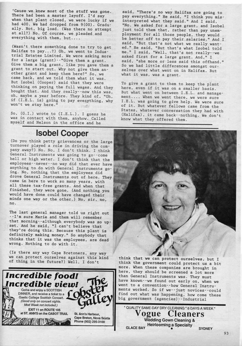 'Cause we knew most of the stuff was gone. There had been a master layoff. I'd say when that plant closed, we were lucky if we had 400. We had dropped from 9(00). Gradu? ally. Not, big load. (Was there no attempt at all?) No. Of course, we pleaded and everything with them, but.... (Wasn't there something done to try to get Halifax to pay...?) Oh, we went to Indus? trial Estates Limited. We were asking more for a large (grant)--"Give them a grant. Give them a big grant, like you gave them a grant to start out. Why not give them an? other grant and keep them here?" So, we came back, and we told them what it was. But Isobel (Cooper) said that they were thinking on paying the full wages. And they bought that. And they really--now this was, oh, maybe a year before. They kind of, "Oh, if (I.E.L. is) going to pay everything, why won't we stay here." q. So, (G.I.) wrote to (I.E.L.). I guess he was in contact with them, anyhow. Called myself and Nelson in the office and he said, "There's no way Halifax are going to pay everything." He said, "I think you mis? interpreted what they said." And I said, "No. We asked for a large grant, and Isobel just told them that, rather than pay unem? ployment for all those people, they would be better off to pay their salaries." And I said, "But that's not what we really want? ed." He said, "But that's what Isobel told me." I said, "Well, that's not really--we asked first for a large grant. And," I said, "she more or less said this offhand." So we had little differences amongst our? selves over what went on in Halifax. But what it was, was a grant. To give a grant to them to keep the plant here, even if it was on a smaller basis. But what went on between I.E.L. and manage? ment.... When we went there, we were sure I.E.L. was going to give help. We were sure of it. But whatever fellows came from the States, whatever conversation they had with (Halifax), it came back--nothing. We don't know what they offered them. Isobel Cooper , (Do you think petty grievances or the large turnover played a role in driving the com? pany away?) No. No, I don't think. I think General Instruments was going to go--come hell or high water. I don't think that the employees--never--no way did that ever have anything to do with General Instruments go? ing. No, nothing that the employees did drove General Instruments out of here. They came in here to work so many years, with all these tax-free grants. And when that finished, they were gone. (And nothing you would have done could have changed their minds one way or the other.) No, sir, no, no. The last general manager told us right out --I'm sure Marie and them will remember that morning--although everybody was so up? set. And he said, "I can't believe that they're doing this. Because this plant is definitely making money." So anybody that thinks that it was the employees, are dead wrong. Nothing to do with it. (Is there any way Cape Bretoners, any way we can protect ourselves against this kind of thing in the future?) Well, I don't Incredible food! Jncredible view! Come and enjoy a SCOTTISH DINNER, and receive a ticket to a Gaelic College Scottish Concert. (Good only on concert nigfits. Mod Week not included.) EXIT11 on ROUTE 105 at ST. ANN'S on the CABOT TRAIL St. Ann's Harbour, Cape Breton, Nova Scotia Phone (902) 295-3100 think that we can protect ourselves, but I think the government could protect us a bit more. When these companies are brought in here, they should be screened a lot more than General Instruments was. They must have known--we found out early on, when we went to a convention--how General Instru? ments worked. So if we--just novices--could find out what was happening, how come these big government (agencies)--Industrial * QUALITY SAME-DAY DRY CLEANING * 6 DAYS A WEEK * Vogue Cleaners Wedding Gown Cleaning & Heirlooming a Specialty