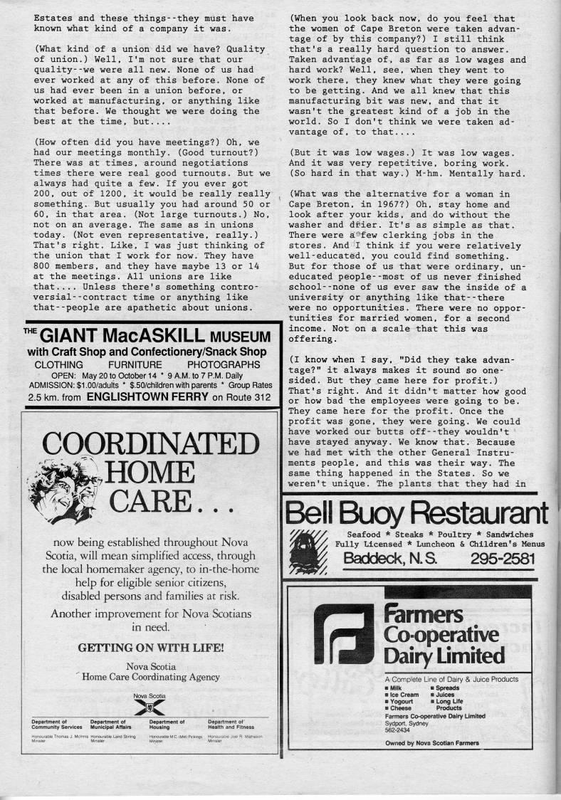 Estates and these things--they must have known what kind of a company it was. (What kind of a union did we have? Quality of union.) Well, I'm not sure that our quality--we were all new. None of us had ever worked at any of this before. None of us had ever been in a union before, or worked at manufacturing, or anything like that before. We thought we were doing the best at the time, but.... (How often did you have meetings?) Oh, we had our meetings monthly. (Good turnout?) There was at times, around negotiations times there were real good turnouts. But we always had quite a few. If you ever got 200, out of 1200, it would be really really something. But usually you had around 50 or 60, in that area. (Not large turnouts.) No, not on an average. The same as in unions today. (Not even representative, really.) That's right. Like, I was just thinking of the union that I work for now. They have 800 members, and they have maybe 13 or 14 at the meetings. All unions are like that.... Unless there's something contro? versial- -contract time or anything like that--people are apathetic about unions. • GIANT IVIacASKILL museum with Craft Shop and Confectionery/Snack Shop CLOTHING FURNITURE PHOTOGRAPHS OPEN: May 20 to October14 * 9 A.M. to 7 P.M. Daily ADMISSION: $1.00/adults * $.50/children with parents * Group Rates 2.5 km. from ENGLISHTOWN FERRY on Route 312 COORDINATED HOME 'CARE... now being established throughout Nova Scotia, will mean simplified access, through the local homemaker agency, to in-the-home help for eligible senior citizens, disabled persons and families at risk. Another improvement for Nova Scotians in need. GETTING ON WITH LIFE! Nova Scotia " Home Care Coordinating Agency >c (When you look back now, do you feel that the women of Cape Breton were taken advan? tage of by this company?) I still think that's a really hard question to answer. Taken advantage of, as far as low wages and hard work? Well, see, when they went to work there, they knew what they were going to be getting. And we all knew that this manufacturing bit was new, and that it wasn't the greatest kind of a job in the world. So I don't think we were taken ad? vantage of, to that.... (But it was low wages.) It was low wages. And it was very repetitive, boring work. (So hard in that way.) M-hm. Mentally hard. (What was the alternative for a woman in Cape Breton, in 1967?) Oh, stay home and look after your kids, and do without the washer and d??ier. It's as simple as that. There were a"few clerking jobs in the stores. And I think if you were relatively well-educated, you could find something. But for those of us that were ordinary, un? educated people--most of us never finished school--none of us ever saw the inside of a university or anything like that--there were no opportunities. There were no oppor? tunities for married women, for a second income. Not on a scale that this was offering. (I know when I say, "Did they take advan? tage?" it always makes it sound so one? sided. But they came here for profit.) That's right. And it didn't matter how good or how bad the employees were going to be. They came here for the profit. Once the profit was gone, they were going. We could have worked our butts off--they wouldn't have stayed anyway. We know that. Because we had met with the other General Instru? ments people, and this was their way. The same thing happened in the States. So we weren't unique. The plants that they had in Bell Buoy Restaurant Seafood * Steaks * Poultry * Sandwiches Fully Licensed * Luncheon & Children's Menus Baddeck, N. a 295-2581 e Rirmers Co-operative Dairy Limited A Complete Line of Dairy & Juice Products ?? Milk ?? Spreads ?? Ice Cream > Juices ?? Yogourt ?? Long Life ?? Cheese Products Farmers Co-operative Dairy Limited Sydport, Sydney 562-2434 Owned by Nova Scotian Farmers
