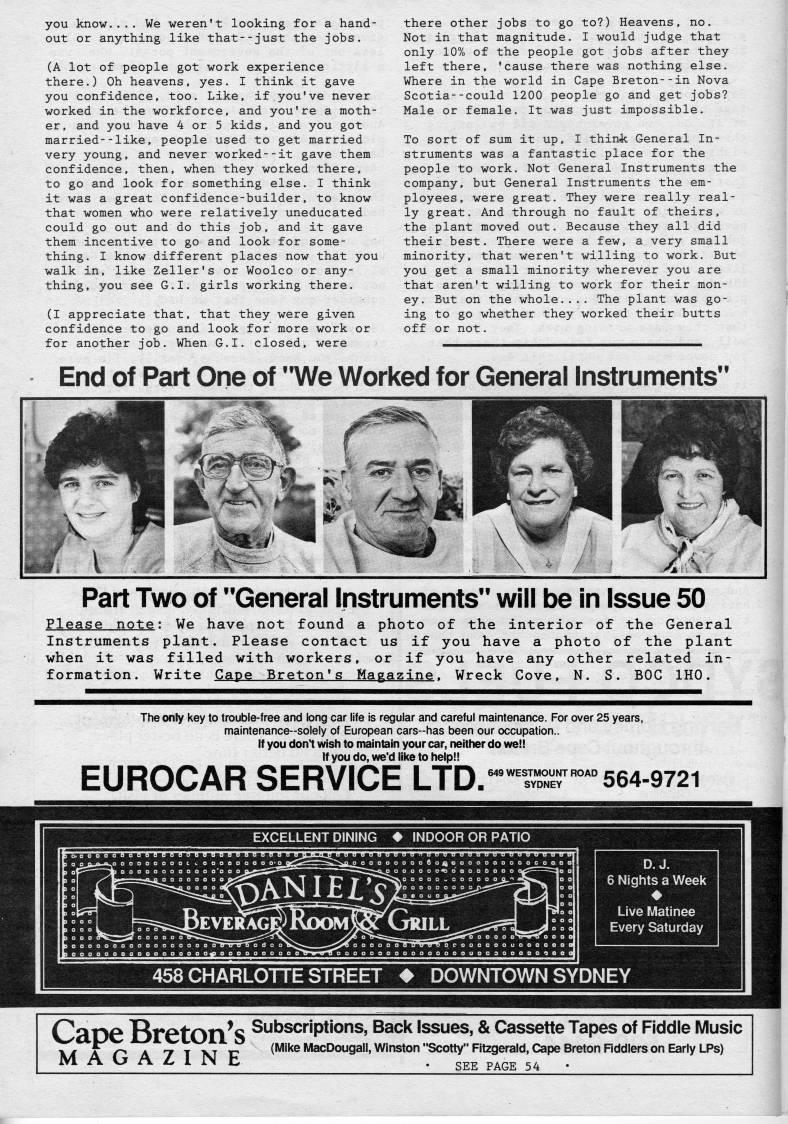 you know.... We weren't looking for a hand? out or anything like that--just the jobs. (A lot of people got work experience there.) Oh heavens, yes. I think it gave you confidence, too. Like, if you've never worked in the workforce, and you're a moth? er, and you have 4 or 5 kids, and you got married--like, people used to get married very young, and never worked--it gave them confidence, then, when they worked there, to go and look for something else. I think it was a great confidence-builder, to know that women who were relatively uneducated could go out and do this job, and it gave them incentive to go and look for some? thing. I know different places now that you walk in, like Zeller's or Wooico or any? thing, you see G.I. girls working there. (I appreciate that, that they were given confidence to go and look for more work or for another job. When G.I. closed, were there other jobs to go to?) Heavens, no. Not in that magnitude. I would judge that only 10% of the people got jobs after they left there, 'cause there was nothing else. Where in the world in Cape Breton--in Nova Scotia--could 1200 people go and get jobs? Male or female. It was just impossible. To sort of sum it up, I think General In? struments was a fantastic place for the people to work. Not General Instruments the company, but General Instruments the em? ployees, were great. They were really real? ly great. And through no fault of theirs, the plant moved out. Because they all did their best. There were a few, a very small minority, that weren't willing to work. But you get a small minority wherever you are that aren't willing to work for their mon? ey. But on the whole.... The plant was go? ing to go whether they worked their butts off or not. End of Part One of "We Worked for General Instruments" Part Two of "General Instruments" will be in Issue 50 Please note: We have not found a photo of the interior of the General Instruments plant. Please contact us if you have a photo of the plant when it was filled with workers, or if you have any other related in? formation. Write Cape Breton's Magazine. Wreck Cove, N. S. BOC IHO. The only key to trouble-free and long car life is regular and careful maintenance. For over 25 years, maintenance-solely of European cars-has been our occupation.. if you don't wish to maintain your car, neither do we!! If you do, we'd like to help!! EUROCAR SERVICE LTD. 649 WESTMOU'' • ROAD SYDNEY 564-9721 EXCELLENT DINING INDOOR OR PATIO D.J. 6 Nights a Week Live Matinee Every Saturday 458 CHARLOTTE STREET DOWNTOWN SYDNEY Caoe BretOn'S subscriptions, Back Issues, & Cassette Tapes of Fiddle Music .- AO A 71 XT I? 'Mike MacDouaali. Winston "Scottv" Fitzaerald. Cane Breton Rddlers on Earlv LPs' (Mike MacDougall, Winston "Scotty" Fitzgerald, Cape Breton Rddlers on Early LPs) SEE PAGE 54