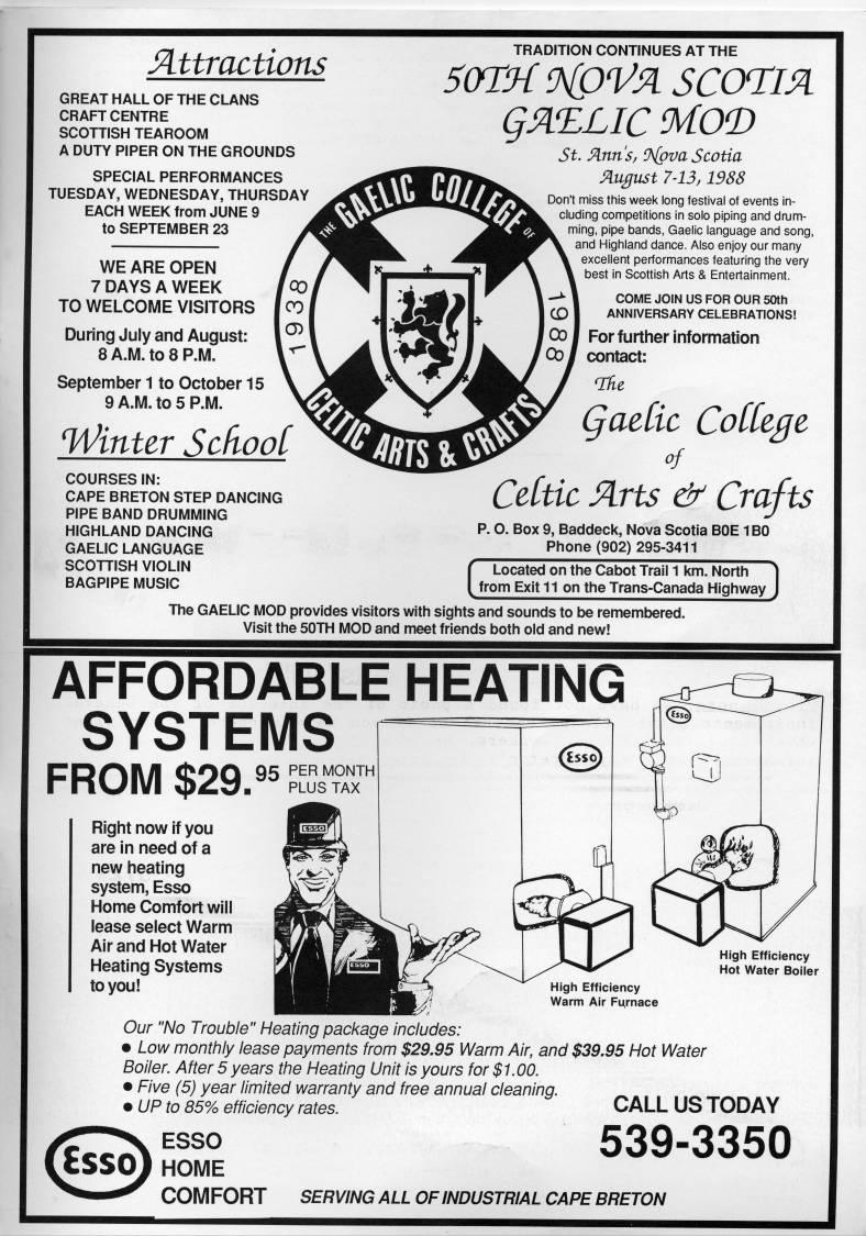 Attractions GREAT HALL OF THE CLANS CRAFT CENTRE SCOTTISH TEAROOM A DUTY PIPER ON THE GROUNDS SPECIAL PERFORMANCES TUESDAY, WEDNESDAY, THURSDAY EACH WEEK from JUNE 9 to SEPTEMBER 23 WE ARE OPEN 7 DAYS A WEEK TO WELCOME VISITORS During July and August: 8 A.M. to 8 P.M. September 1 to October 15 9 A.M. to 5 P.M. Winter School COURSES IN: CAPE BRETON STEP DANCING PIPE BAND DRUMMING HIGHLAND DANCING GAELIC LANGUAGE SCOTTISH VIOLIN BAGPIPE MUSIC TRADITION CONTINUES AT THE St' Unit's, 0[pva Scotia August 7-13,1988 Don't miss this week long festival of events in? cluding competitions in solo piping and dmm- ming, pipe bands, Gaelic language and song, and Highland dance. Also enjoy our many excellent performances featuring the very best in Scottish Arts & Entertainment. COME JOIN US FOR OUR 50th ANNIVERSARY CELEBRATIONS! For further information contact: QaeCic CotUgc of cdtic Arts & Crafts p. O. Box 9, Baddeck, Nova Scotia BOE 1 BO Phone (902) 295-3411 Located on the Cabot Trail 1 km. North from Exit 11 on the Trans-Canada Highway The GAELIC MOD provides visitors with sights and sounds to be remembered. Visit the 50TH MOD and meet friends both old and new! AFFORDABLE HEATING SYSTEMS FROM $29.'= Right now if you are in need of a new heating system, Esso Home Comfort will lease select Warm Air and Hot Water Heating Systems to you! High Efficiency Hot Water Boiler High Efficiency Warm Air Furnace Our "No Trouble" Heating package includes: • Low monthly lease payments from $29.95 Warm Air, and $39.95 Hot Water Boiler. After 5 years the Heating Unit is yours for $1.00. • Five (5) year limited warranty and free annual cleaning. ' ., , , ,o -r'r> • UP to 85% efficiency rates. CALL US TODAY r' ' ESSO .CSSOI HOME COMFORT 539-3350 SERVING ALL OF INDUSTRIAL CAPE BRETON