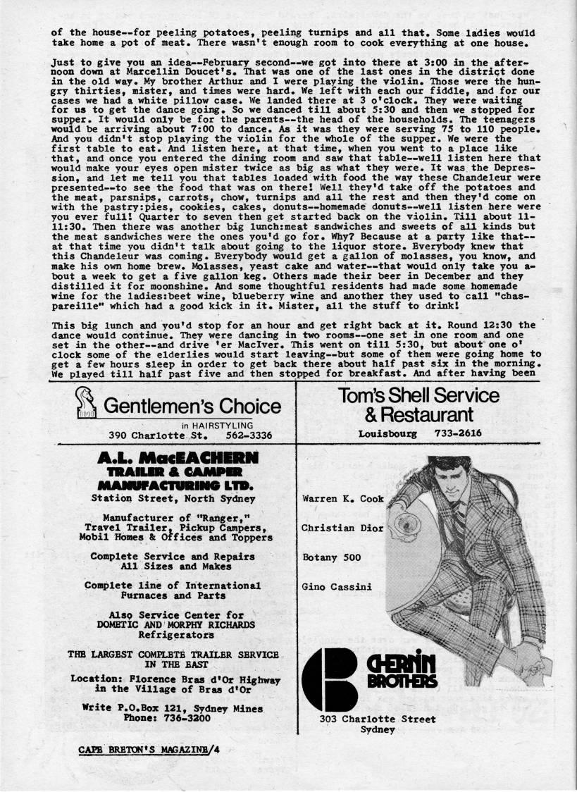 Published by Ronald Caplan on 1975/3/31 (648 reads)of the house • for peeling potatoes, peeling turnips and all that. Some ladies woUld take home a pot of meat. There wasn't enough room to cook everything at one house. Just to give you an idea • February second • we got into there at 3:00 in the after? noon down at Marcellin Doucet's. That was one of the last ones in the district done in the old way. My brother Arthur and I were playing the violin. Those were the hun? gry thirties, mister, and times were hard. We left with each our fiddle, and for our cases we had a white pillow case. We landed there at 3 o'clock. They were waiting for us to get the dance going. So we danced till about 5:30 and then we stopped for supper. It would only be for the parents • the head of the households. The teenagers would be arriving about 7:00 to dance. As it was they were servii' 75 to 110 people. And you didn't stop playing the violin for the whole of the supper. We were the first table to eat. And listen here, at that time, when you went to a place like that, and once you entered the dining room and saw that table • well listen here that would make your eyes open mister twice as big as what they were. It was the Depres? sion, and let me tell you that tables loaded with food the way these Chandeleur were presented • to see the food that was on thereI Well they'd take off the potatoes and the meat, parsnips, carrots, chow, turnips and all the rest and then they'd come on with the pastry:pies, cookies, cakes, donuts • homemade donuts • well listen here were you ever fulll Charter to seven then get started back on the violin. Till about 11- 11:30. Then there was another big lunch:meat sandwiches and sweets of all kinds but the meat sandwiches were the ones you'd go for. Why? Because at a party like that • at that time you didn't talk about going to the liquor store. Everybody knew that this Chandeleur was coming. Everybody would get a gallon of molasses, you know, and make his own home brew. Molasses, yeast cake and water • that would only take you a- bout a week to get a five gallon keg. Others made their beer in December and they distilled it for moonshine. And some thotightful residents had made some homemade wine for the ladies:beet wine, blueberry wine and another they used to call "chas- pareille" which had a good kick in it. Mister, all the stuff to drinkI This big lunch and you'd stop for an hour and get right back at it. Round 12:30 the dance would continue. They were dancing in two rooms • one set in one room and one set in the other • and drive 'er Maclver. This went on till 5:30, but about one o' clock some of the elderlies would start leaving • but some of thera were going home to get a few hours sleep in order to get back there about half past six in the morning. We played till half past five and then stopped for breakfast. And after having been Gentlemen's Choice in HAIRSTYLING 390 Charlotte St. 562-3336 Tom's Shell Service & Restaurant Louisbourg 733-2616 A.I.. MacEACHimf TRiULIR A CAMMR IMAIIIiPACllillliW Ln. station Street, North Sydney Manufacturer of "Ranger," Travel Trailer. Pickup Campers, Mobil Hones & Otfices and Toppers Complete Service and Repairs All Sizes and Makes Complete line of International Furnaces and Parts Alsp Service Center for DOMETIC AND MORPHY RICHARDS Refrigerators THB LARGEST COMPLETE TRAILER SERVICE IN THE EAST Location: Florence Bras d'Or Highway in the Village of Bras d'Or Write P.O.Box 121, Sydney Mines Phone: 736-3200 CAPB BRETON'S MAGA2INB/4 Warren K, Cook Christian Dior Botany 500 Gino Cassini I .* mm ocnin 303 Charlotte Street Sydney