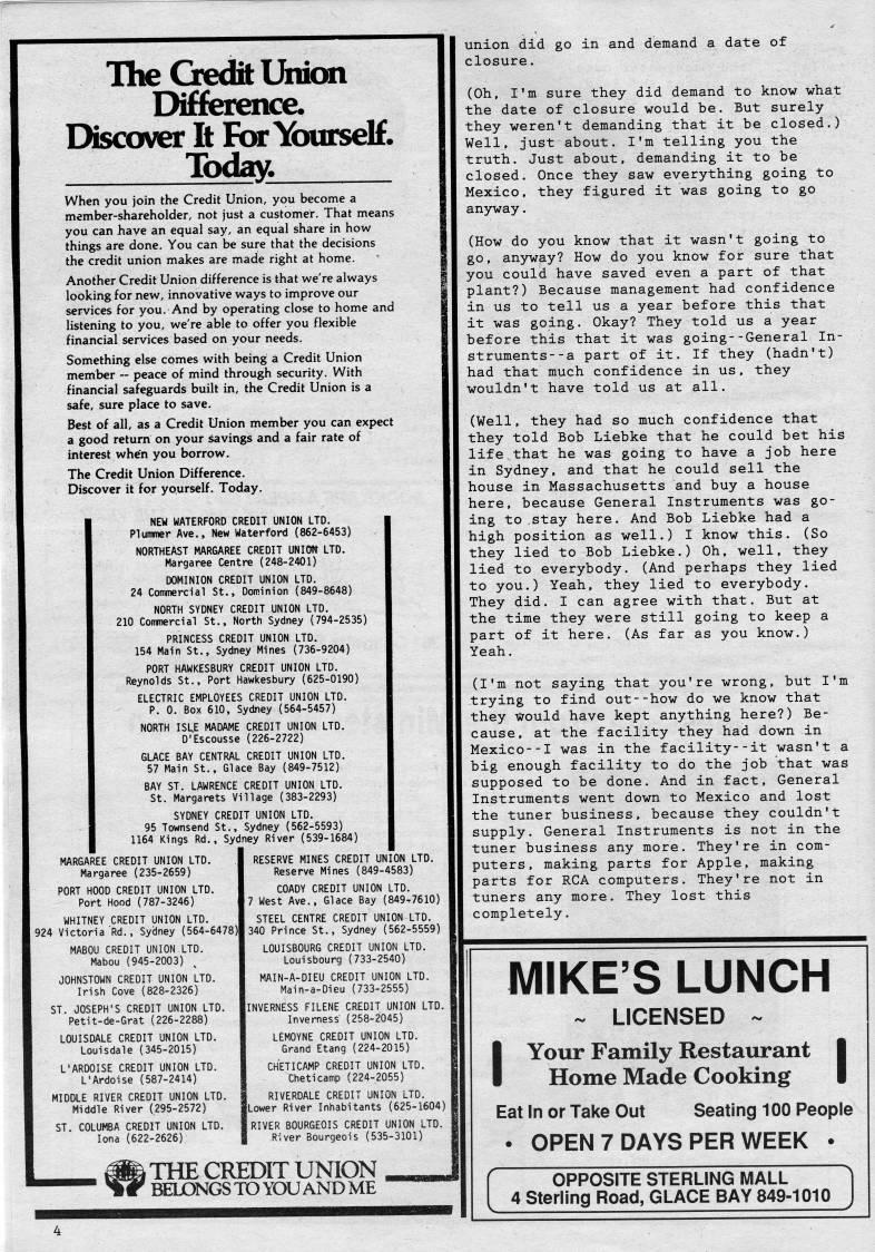 Hie Credit Oman Di??feten??e. Discnfver It For'burseE Today. When you join the Credit Union, you become a member-shareholder, not just a customer. That means you can have an equal say, an equal share in how things are done. You can be sure that the decisions the credit union makes are made right at home. Another Credit Union difference is that we're always looking for new, innovative ways to improve our services for you. And by operating close to home and listening to you, we're able to offer you flexible financial services based on your needs. Something else comes with being a Credit Union member • peace of mind through security. With financial safeguards built in, the Credit Union is a safe, sure place to save. Best of all, as a Credit Union member you can expect a good return on your savings and a fair rate of interest when you borrow. The Credit Union Difference. Discover it for yourself. Today. NEW WATERFORD CREDIT UNION LTD. Plummer Ave., New Waterford (862-6453) NORTHEAST MARGAREE CREDIT UNION LTD, Margaree Centre (248-2401) DOMINION CREDIT UNION LTD. 24 Commercial St., Dominion (849-8648) NORTH SYDNEY CREDIT UNION LTD. 210 Comnercial St., North Sydney (794-2535) PRINCESS CREDIT UNION LTD. 154 Main St., Sydney Mines (736-9204) PORT HAWKESBURY CREDIT UNION LTD. Reynolds St., Port Hawkesbury (625-0190) ELECTRIC EMPLOYEES CREDIT UNION LTD. P. 0. Box 610, Sydney (564-5457) NORTH ISUE MADAME CREDIT UNION LTD. D'Escousse (226-2722) GLACE BAY CENTRAL CREDIT UNION LTD. 57 Main St., Glace Bay (849-7512) BAY ST. LAWRENCE CREDIT UNION LTD. St. Margarets Village (383-2293) SYDNEY CREDIT UNION LTD. 95 Townsend St., Sydney (562-5593) 1164 Kings Rd., Sydney River (539-1684) MARGAREE CREDIT UNION LTD. Margaree (235-2659) PORT HOOD CREDIT UNION LTD. Port Hood (787-3246) WHITNEY CREDIT UNION LTD. 924 Victoria Rd., Sydney (564-647 MABOU CREDIT UNION LTD. Mabou (945-2003) JOHNSTOWN CREDIT UNION LTD. Irish Cove (828-2326) ST. JOSEPH'S CREDIT UNION LTD. Petit-de-6rat (226-2288) LOUISDALE CREDIT UNION LTD. Louisdale (345-2015) L'ARDOISE CREDIT UNION LTD. L'Ardoise (587-2414) MIDDLE RIVER CREDIT UNION LTD. Middle River (295-2572) ST. COLUMBA CREDIT UNION LTD. lona (622-2626) RESERVE MINES CREDIT UNION LTD. Reserve Mines (849-4583) COADY CREDIT UNION LTD. 7 West Ave., Glace Bay (849'7610) STEEL CENTRE CREDIT UNION LTD. 340 Prince St., Sydney (562-5559) LOUISBOURG CREDIT UNION LTD. Louisbourg (733-2540) MAIN-A-DIEU CREDIT UNION LTD. Main-a-Dieu (733-2555) :iNVERNESS FILENE CREDIT UNION LTD. Inverness (258-2045) LEMOYNE CREDIT UNION LTD. Grand Etang (224-2015) CHETICAMP CREDIT UNION LTD. Cheticamp (224-2055) RIVERDALE CREDIT UNION LTD. [Lower River Inhabitants (625-1604) RIVER BOURGEOIS CREDIT UNION LTD. River Bourgeois (535-3101) i THE CREDIT UNION BEIjONGS TO YOU AND ME union did go in and demand a date of closure. (Oh, I'm sure they did demand to know what the date of closure would be. But surely they weren't demanding that it be closed.) Well, just about. I'm telling you the truth. Just about, demanding it to be closed. Once they saw everything going to Mexico, they figured it was going to go anyway. (How do you know that it wasn't going to go, anyway? How do you know for sure that you could have saved even a part of that plant?) Because management had confidence in us to tell us a year before this that it was going. Okay? They told us a year before this that it was going--General In? struments- -a part of it. If they (hadn't) had that much confidence in us, they wouldn't have told us at all. (Well, they had so much confidence that they told Bob Liebke that he could bet his life that he was going to have a job here in Sydney, and that he could sell the house in Massachusetts and buy a house here, because General Instruments was go? ing to stay here. And Bob Liebke had a high position as well.) I know this. (So they lied to Bob Liebke.) Oh, well, they lied to everybody. (And perhaps they lied to you.) Yeah, they lied to everybody. They did. I can agree with that. But at the time they were still going to keep a part of it here. (As far as you know.) Yeah. (I'm not saying that you're wrong, but I'm trying to find out--how do we know that they 'ould have kept anything here?) Be? cause, at the facility they had down in Mexico--I was in the facility--it wasn't a big enough facility to do the job that was supposed to be done. And in fact. General Instruments went down to Mexico and lost the tuner business, because they couldn't supply. General Instruments is not in the tuner business any more. They're in com? puters, making parts for Apple, making parts for RCA computers. They're not in tuners any more. They lost this completely. 1 MIKE'S LUNCH ' LICENSED ~ 1 Your Family Restaurant 1 1 Home Made Cooking 1 Eat In or Take Out Seating 100 People . OPEN 7 DAYS PER WEEK • f OPPOSITE STERLING MALL 1 [ 4 Sterling Road, GLACE BAY 849-1010 J