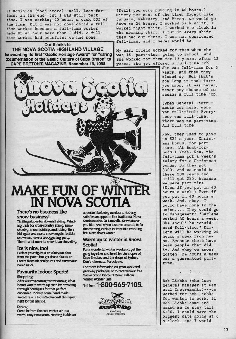 at Dominion (food store)--well, Best-for- Less, in the end--but I was still part- time. I was working 40 hours a week 90% of the time. But I was not considered a full- time worker because a full-time worker made $3 an hour more than I did. A full- time worker had benefits; we had none. Our thanks to THE NOVA SCOTIA HIGHLAND VILLAGE for awarding its first "Gaelic Heritage Award" for "caring documentation of the Gaelic Culture of Cape Breton" to CAPE BRETON'S MAGAZINE. November 18,1988 AAAKEFUNOF IN NOVA SCOTIA There's no business like snow business! Hirilling slopes for downhill skiing. Wind? ing trafls for aoss<:ountry skiing snow- shoeing, snowmobiling, and hiking. Be a kid again and make snow angels, build a snowman, have a tobogganing party. There's a lot more to snow than shoveling. Ice is nice, too! Perfect your figure-8 or take your shot from the point, but get those skates on! Create femtastic sculptures and carve your name in ice. Favourite Indoor Sports! shopping After an invigorating winter outing, wrtiat better way to warm up than by browsing through boutiques for that perfect ensemble. Pick up some hand-made sweaters or a Nova Scotia aaft that's just right for the mantie. appetite like being ourdoors. Nothing satisfies an appetite like traditional Nova Scotia cuisine. Or Nouvelle. Or whatever you like. And, when it's time to setde in for the evening, curl up in front of a aackling fire. Now, that's winter. Warm up to winter in Snova Scotia! For a wonderful winter weekend, get the gang together and head for the slopes of Cape Smokey and the shops of Sydney. Don't hibernate. Participate. For more information on great weekend getaway packages, or to receive your free Snova Scotia Discount Book, call our Winter Wonder line. Tbiift' 1-800-565-7105. Come in from the cool winter air to a warm, cozy restaurant Nothing builds an (Still you were putting in 40 hours.) Ninety per cent of the time. Except like January, February, and March, we would go down to 24 hours. I worked back shift, I worked night shift, I worked 6 o'clock in the morning shift. I put in every shift they had out there. I was not considered full-time, and I never would be. My girl friend worked for them when she was 16, part-time, going to school. And she worked for them for 13 years. After 13 years, she got offered a full-time job. ~~ She was full-time for 3 years, and then they closed up. But that's how long it took for-- you know, it was never, never any chance of me seeing a full-time job. (When General Instru? ments was here, were you full-time?) Every? body was full-time. There was no part-time. All full-time. Now, they used to give us $25 a year, Christ? mas bonus, for part- time. (At Best-for- Less.) Yeah. Now, the full-time got a week's salary for a Christmas bonus. So they got $300. And we could be there 200 years and still get $25, because we were part-time. (Even if you put in 40 hours a week.) Even if you put in 40 hours a week. And, okay, I could have gone to the union.... They would go to management: "Darlene worked 40 hours a week. She should be consid? ered full-time." Dar? lene will be working 24 hours a week from now on. Because there have been people that did it. And they've never gotten--24 hours a week was a guaranteed part- time. Bob Liebke (the last general manager at Gen? eral Instruments)--you worked for Bob Liebke. You wanted to work. If Bob Liebke came and asked me to stay till 6:30, I could have the biggest date going at 6 o'clock, and I would