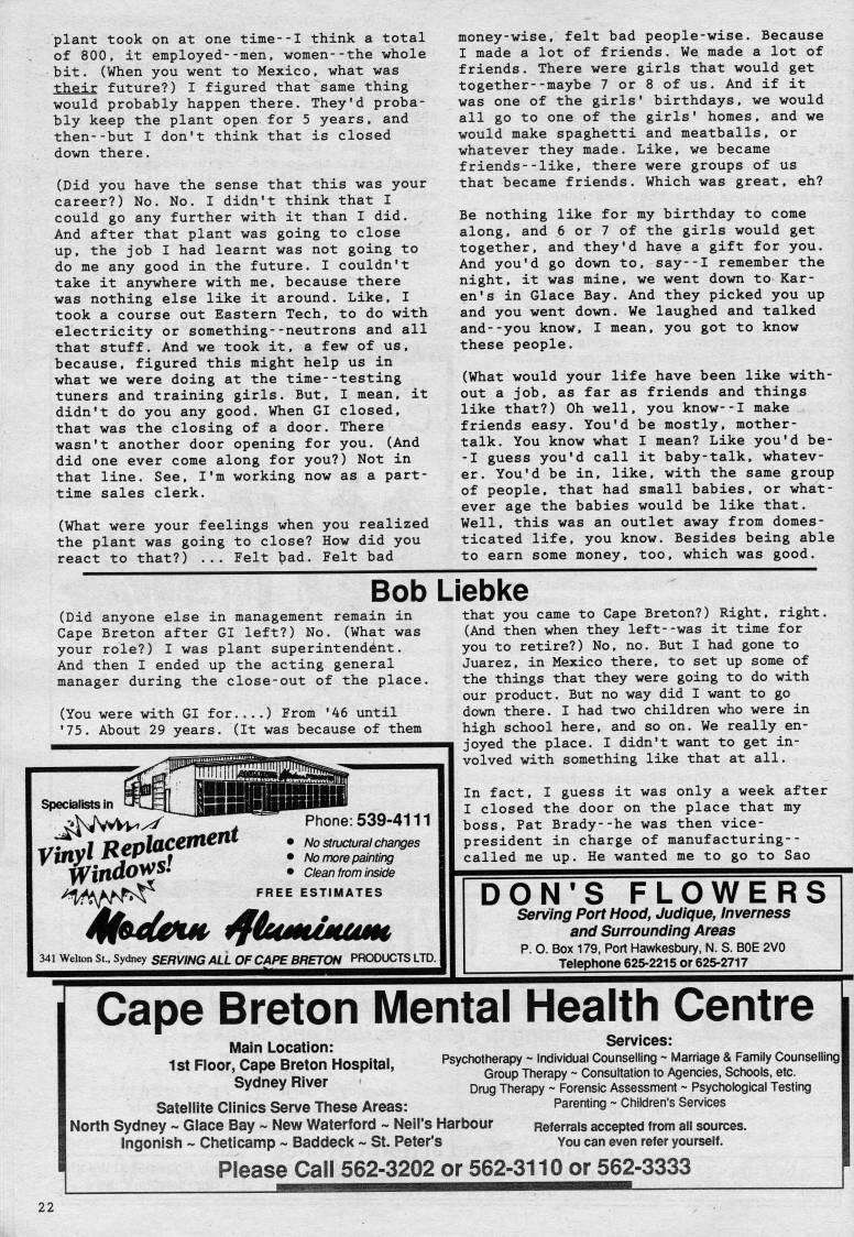 plant took on at one time--I think a total of 800, it employed--men, women--the whole bit. (When you went to Mexico, what was their future?) I figured that same thing would probably happen there. They'd proba? bly keep the plant open for 5 years, and then--but I don't think that is closed down there. (Did you have the sense that this was your career?) No. No. I didn't think that I could go any further with it than I did. And after that plant was going to close up, the job I had learnt was not going to do me any good in the future. I couldn't take it anywhere with me, because there was nothing else like it around. Like, I took a course out Eastern Tech, to do with electricity or something--neutrons and all that stuff. And we took it, a few of us, because, figured this might help us in what we were doing at the time--testing tuners and training girls. But, I mean, it didn't do you any good. When Gl closed, that was the closing of a door. There wasn't another door opening for you. (And did one ever come along for you?) Not in that line. See, I'm working now as a part- time sales clerk. (What were your feelings when you realized the plant was going to close? How did you react to that?) ... Felt 'ad. Felt bad money-wise, felt bad people-wise. Because I made a lot of friends. We made a lot of friends. There were girls that would get together--maybe 7 or 8 of us. And if it was one of the girls' birthdays, we would all go to one of the girls' homes, and we would make spaghetti and meatballs, or whatever they made. Like, we became friends--like, there were groups of us that became friends. Which was great, eh? Be nothing like for my birthday to come along, and 6 or 7 of the girls would get together, and they'd have a gift for you. And you'd go down to, say--I remember the night, it was mine, we went down to Kar? en's in Glace Bay. And they picked you up and you went down. We laughed and talked and--you know, I mean, you got to know these people. (What would your life have been like with? out a job, as far as friends and things like that?) Oh well, you know--I make friends easy. You'd be mostly, mother- talk. You know what I mean? Like you'd be- -I guess you'd call it baby-talk, whatev? er. You'd be in, like, with the same group of people, that had small babies, or what? ever age the babies would be like that. Well, this was an outlet away from domes? ticated life, you know. Besides being able to earn some money, too, which was good. Bob Liebl(e (Did anyone else in management remain in Cape Breton after Gl left?) No. (What was your role?) I was plant superintendent. And then I ended up the acting general manager during the close-out of the place. (You were with Gl for....) From '46 until '75. About 29 years. (It was because of them Specialists in 341 Welton St., Sydney SERVING ALL OF CAPE BRETON PRODUCTS LTD. Phone:539-4111 • No structural changes • No more painting • Clean from inside FREE ESTIMATES that you came to Cape Breton?) Right, right. (And then when they left--was it time for you to retire?) No, no. But I had gone to Juarez, in Mexico there, to set up some of the things that they were going to do with our product. But no way did I want to go down there. I had two children who were in high school here, and so on. We really en? joyed the place. I didn't want to get in? volved with something like that at all. In fact, I guess it was only a week after I closed the door on the place that my boss, Pat Brady--he was then vice- president in charge of manufacturing-- called me up. He wanted me to go to Sao DON'S FLOWERS Serving Port Hood, Judique, Inverness and Surrounding Areas p. O. Box 179, Port Hawkesbury, N. S. BOE 2V0 Telephone 625-2215 or 625-2717 Cape Breton Mental Health Centre Main Location: 1st Floor, Cape Breton Hospital, Sydney River Satellite Clinics Serve These Areas: North Sydney - Glace Bay ~ New Waterford ~ Neil's Harbour Ingonish ~ Cheticamp ~ Baddeck ~ St. Peter's Please Call 562-3202 or 562-3110 or 562-3333 Services: Psychotherapy ~ Individual Counselling ~ Marriage & Family Counselling Group Therapy - Consultation to Agencies, Schools, etc. Drug Therapy ~ Forensic Assessment ~ Psychological Testing Parenting - Children's Sen/ices Referrals accepted from all sources. You can even refer yourself.
