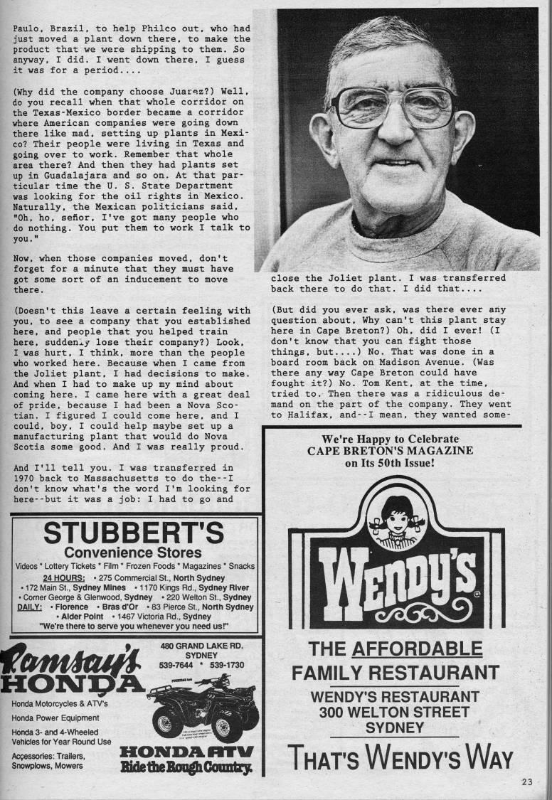 Paulo, Brazil, to help Philco out, who had just moved a plant down there, to make the product that we were shipping to them. .So anjrway, I did. I went down there, I guess it was for a period.... (Why did the company choose Juarez?) Well, do you recall when that whole corridor on the Texas-Mexico border became a corridor where American companies were going down there like mad, setting up plants in Mexi? co? Their people were living in Texas and going over to work. Remember that whole area there? And then they had plants set up in Guadalajara and so on. At that par? ticular time the U. S. State Department was looking for the oil rights in Mexico. Naturally, the Mexican politicians said, "Oh, ho, sefior, I've got many people who do nothing. You put them to work I talk to you." Now, when those companies moved, don't forget for a minute that they must have got some sort of an inducement to move there. (Doesn't this leave a certain feeling with you, to see a company that you established here, and people that you helped train here, sudden'./ lose their company?) Look, I was hurt, I think, more than the people who worked here. Because when I came from the Joliet plant, I had decisions to make. And when I had to make up my mind about coming here. I came here with a great deal of pride, because I had been a Nova Sco- tian. I figured I could come here, and I could, boy, I could help maybe set up a manufacturing plant that would do Nova Scotia some good. And I was really proud. And I'll tell you. I was transferred in 1970 back to Massachusetts to do the--I don't know what's the word I'm looking for here--but it was a job: I had to go and STUBBERT'S Convenience Stores Videos * Lottery Tickets * Film * Frozen Foods * Magazines * Snacks 24 HOURS: • 275 Commercial St., North Sydney • 172 Main St., Sydney Mines • 1170 Kings Rd., Sydney River • Corner George & Glenwood, Sydney • 220 Welton St., Sydney DAILY: • Florence • Bras d'Or • 83 Pierce St., North Sydney • Alder Point • 1467 Victoria Rd., Sydney "We're there to serve you whenever you need us!" Honda Motorcycles & ATV's Honda Power Equipment Honda 3- and 4-Wheeled Vehicles for Year Round Use 480 GRAND LAKE RD. SYDNEY 539-7644 * 539-1730 Accessories: Trailers, Snowplows, Mowers close the Joliet plant. I was transferred back there to do that. I did that.... (But did you ever ask, was there ever any question about. Why can't this plant stay here in Cape Breton?) Oh, did I ever! (I don't know that you can fight those things, but....) No. That was done in a board room back on Madison Avenue. (Was there any way Cape Breton could have fought it?) No. Tom Kent, at the time, tried to. Then there was a ridiculous de? mand on the part of the company. They went to Halifax, and--I mean, they wanted some- BideflieBoagbCoiiiilZ]!' We're Happy to Celebrate CAPE BRETON'S MAGAZINE on Its 50th Issue! THE AFFORDABLE FAMILY RESTAURANT WENDY'S RESTAURANT 300 WELTON STREET SYDNEY That's Wendy's Way
