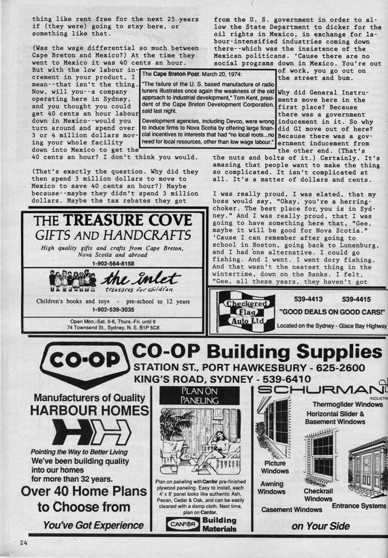 thing like rent free for the next 25 years if (they were) going to stay here, or something like that. (Was the wage differential so much between Cape Breton and Mexico?) At the time they went to Mexico it was 40 cents an hour. But with the low labour in crement in your product, I mean--that isn't the thing Now, will you--a company operating here in Sydney, and you thought you could get 40 cents an hour labour down in Mexico--would you turn around and spend over 3 or 4 million dollars mov? ing your whole facility down into Mexico to get the' 40 cents an hour? I don't think you would. (That's exactly the question. Why did they then spend 3 million dollars to move to Mexico to save 40 .cents an hour?) Maybe because--maybe they didn't spend 3 million dollars. Maybe the tax rebates they got The Cape Breton Post: March 20,1974: "The failure of the U. S. based manufacture of radio tuners illustrates once again the weakness of the old approach to industrial development," Tom Kent, presi? dent of the Cape Breton Development Corporation, said last night. from the U. S. government in order to al? low the State Department to dicker for the oil rights in Mexico, in exchange for la? bour-intensified industries coming down there--which was the insistence of the Mexican politicans. 'Cause there are no social programs down in Mexico. You're out of work, you go out on the street and bum. Development agencies, including Devco, were wrong to induce firms to Nova Scotia by offering large finan? cial incentives to interests that had "no local roots...no need for local resources, other than low wage labour." THE TREASURE COVE GIFTS AND HANDCRAFTS High quality gifts and crafts from Cape Breton, Nova Scotia and abroad 1-902-564-8158 Children's books and toys - pre-school to 12 years 1-902-539-3035 Open Mon.-Sat. 9-6, Thurs.-Fri. until 9 74 Townsend St., Sydney, N. S. B1P 508 Why did General Instru? ments move here in the first place? Because there was a government inducement in it. So why did Gl move out of here? Because there was a gov? ernment inducement from the other end. (That's the nuts and bolts of it.) Certainly. It's amazing that people want to make the thing so complicated. It isn't complicated at all. It's a matter of dollars and cents. I was really proud, I was elated, that my boss would say, "Okay, you're a herring- choker. The best place for. you is in Syd? ney." And I was really proud, that I was going to have something here that, "Gee, maybe it will be good for Nova Scotia." 'Cause I can remember after going to school in Boston, going back to Lunenburg, and I had one alternative. I could go fishing. And I went. I went dory fishing. And that wasn't the neatest thing in the wintertime, down on the Banks. I felt, "Gee, all these years, they haven't got 539-4413 539-4415 "GOOD DEALS ON GOOD CARS!" Located on the Sydney - Glace Bay Highway C'~r CO-OP Building Supplies ' V %/K STATION ST.. PORT HAWKESBURY - 625-2600 KING'S ROAD, SYDNEY - 539-6410 d 'C;i • ILJF'I/l>'r|C Manufacturers of Quality HARBOUR HOMES MIH) Pointing the Way to Better Living We've been building quality into our homes for more than 32 years. Over 40 Home Plans to Choose from You've Got Experience PLAN ON PANELING Plan on paneling with Cantor pre-finished plywood paneling. Easy to install, each 4' X 8' panel looks like authentic Ash, Pecan, Cedar & Oak, and can be easily cleaned with a damp cloth. Next time, plan on Cantor. Building IMateriais Thermogllder Windows Horizontal Slider & Basement Windows Picture Windows Awning Windows Checkrail Windows Casement Windows Entrance Systems on Your Side