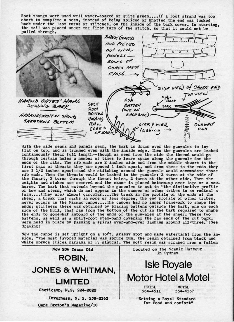 Published by Ronald Caplan on 1975/3/31 (638 reads)Root thongs were used well water-soaked or quite green....If a root strand was too short to complete a seam, instead of being spliced or knotted the end was tucked back under the last turns or stitches, on the inside of the bark cover. In starting, the tail was placed under the first turn of the stitch, so that it could not be pulled through. P/'' • 'JL s ??oores c' SP'iT Root 5 !>e '('' c' MfJoe??A}t' Top vietJ VJith the side seams and panels sewn, the bark is drawn over the gunwales to lay flat on top, and is trimmed even with the inside edge. Then the gunwales are lashed continuously their full length • though as seen from the side the thread would go through certain holes a number of times to leave space along the gunwale for the ends of the ribs. The rib ends are 2 inches wide and from the middle thwart to the first pair of thwarts they are spaced 1 inch apart, and from there to the eiids they are 1 1/2 inches apart • and the stitching around the gunwale would accomodate those rib ends. Then the thwarts would be lashed to the gunwale: 2 turns at the side of the thwart, 3 turns through the thwart holes, 2 turns at the other side. Then the weights and stakes are removed and the canoe is placed bottom-up over logs or a saw- horse. The bark that extends beyond the gunwales is cut to "the distinctive profile of bow and stern, which do not appear in the canoes of other tribes in so radical a form...,(They are; almost circular.,..The break in the profile of the ends at the sheer, a break that marks in more or less degree, the end profile of other tribes, never occurs in the Micmac canoe....The canoes had no inner framework to shape the ends; stiffness there was obtained by placing battens outside the bark, one on each side of the hull, that ran from the bottom of the cut in the bark required to shape the ends to somewhat inboard of the ends of the gunwales at the sheer. These two battens, as well as a split-root stem-band covering the raw ends of the cut bark, were held in place by passii' a spiral over-and-over lashing around all'three.'' (See drawing) Now the canoe is set upright on a soft, grassy spot and made watertight from the in? side. "The most favored material was spruce gum, the resin obtained from black and white spruce (Picea mariana or P. glauca). The soft resin was scraped from a fallen Now 206 Years Old ROBIN, JONES 8c WHITMAN, LIMITED Cheticamp, N.S. 224-2022 Inverness, N. S. 258-2362 Cape Breton's Magazine/lO Located on the Scenic Harbour in Sydney Isle Royale Motor Hotel & Motel HOTEL 564-4511 MOTEL 564-4567 "Setting a Royal Standard for food and comfort"