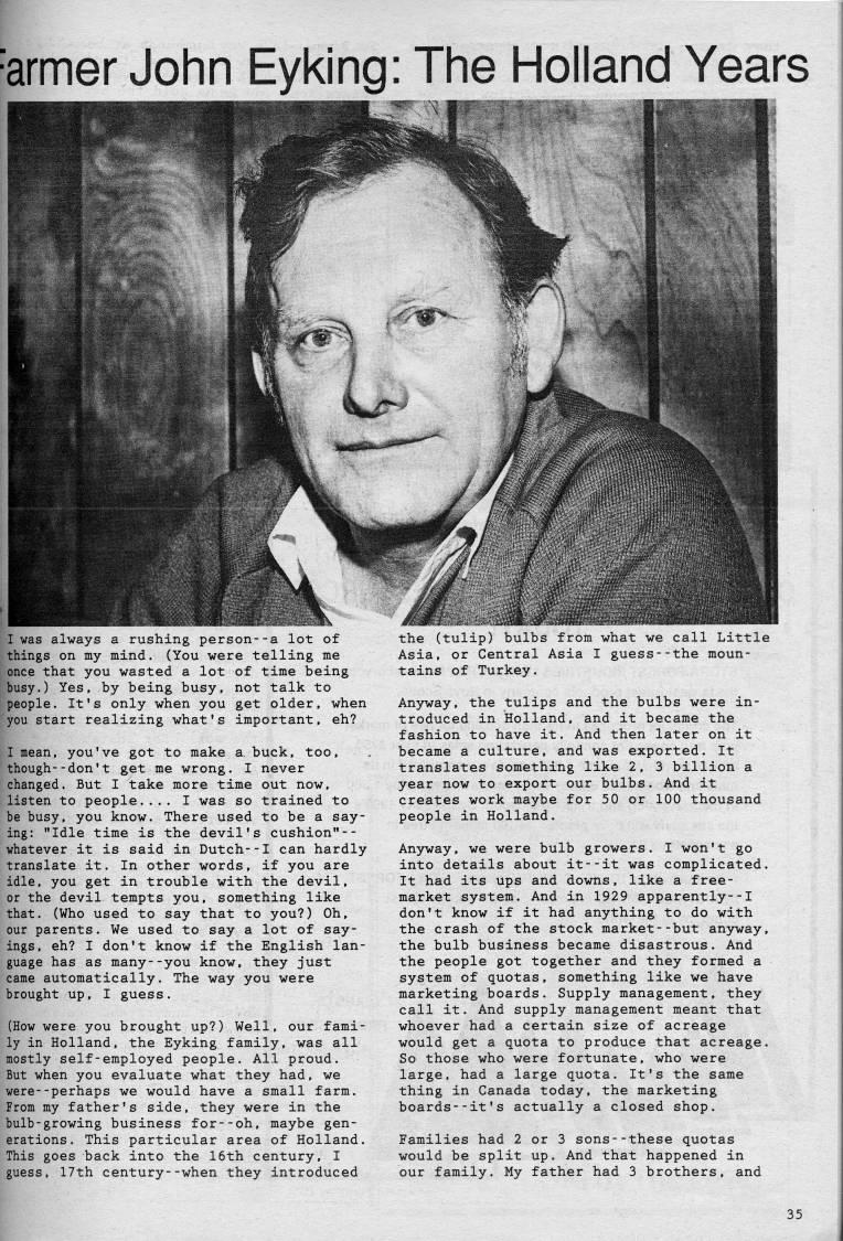 Published by Ronald Caplan on 1989/1/1 (735 reads)armer John Eyking: The Holland Years I was always a rushing person--a lot of things on my mind. (You were telling me once that you wasted a lot of time being busy.) Yes. by being busy, not talk to people. It's only when you get older, when you start realizing what's important, eh? I mean, you've got to make a buck, too, though--don't get me wrong. I never changed. But I take more time out now, listen to people.... I was so trained to be busy, you know. There used to be a say? ing: "Idle time is the devil's cushion"-- whatever it is said in Dutch--I can hardly translate it. In other words, if you are idle, you get in trouble with the devil, or the devil tempts you, something like that. (Who used to say that to you?) Oh, our parents. We used to say a lot of say? ings, eh? I don't know if the English lan? guage has as many--you know, they just came automatically. The way you were brought up, I guess. (How were you brought up?) Well, our fami? ly in Holland, the Eyking family, was all mostly self-employed people. All proud. But when you evaluate what they had, we were--perhaps we would have a small farm. From my father's side, they were in the bulb-growing business for--oh, maybe gen? erations. This particular area of Holland. This goes back into the 16th century, I 17th century--when they introduced the (tulip) bulbs from what we call Little Asia, or Central Asia I guess--the moun? tains of Turkey. Anyway, the tulips and the bulbs were in? troduced in Holland, and it became the fashion to have it. And then later on it became a culture, and was exported. It translates something like 2, 3 billion a year now to export our bulbs. And it creates work maybe for 50 or 100 thousand people in Holland. Anyway, we were bulb growers. I won't go into details about it--it was complicated. It had its ups and downs, like a free- market system. And in 1929 apparently--I don't know if it had anything to do with the crash of the stock market--but anyway, the bulb business became disastrous. And the people got together and they formed a system of quotas, something like we have marketing boards. Supply management, they call it. And supply management meant that whoever had a certain size of acreage would get a quota to produce that acreage. So those who were fortunate, who were large, had a large quota. It's the same thing in Canada today, the marketing boards--it's actually a closed shop. Families had 2 or 3 sons--these quotas would be split up. And that happened in our family. My father had 3 brothers, and