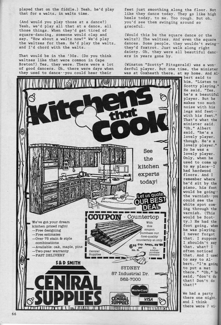 Published by Ronald Caplan on 1989/1/1 (146 reads)played that on the fiddle.) Yeah, he'd play that for a waltz, in waltz time. (And would you play those at a dance?) Yeah, we'd play all that at a dance, all those things. When they'd get tired of square-dancing, someone would clap and say, "How about a waltz now?" We'd play the waltzes for them. He'd play the waltz, and I'd chord with the waltz. That would be in the '30s. (Do you think waltzes like that were common in Cape Breton?) Yes, they were. There were a lot of good dancers. Oh, there were days when they used to dance--you could hear their We've got your dream kitchen priced right! • Free designing • Free estimates • Over 75 stain & style combinations • Available: oak, maple, pine -Two-year warranty • FAST DELIVERY S&D; SMITH [C0UP(??' ?? Supplies ~'~~''' CENlR&L; 'SUPPUESH feet just smoothing along the floor. Not like they dance today. They go like high heels today, to me. Too rough. But oh, you'd see them swinging around so graceful. (Would this be the square dance or the waltz?) The waltzes. And even the square dances. Some people, they wouldn't swing-- they'd foxtrot. Just walk along right dainty. Oh, they were all beautiful danc? ers in years gone by. (Winston "Scotty" Fitzgerald) was a won? derful player. But one time, the minister was at Coxheath there, at my home. And Al? bert said to him, "Listen to Scotty playing." He said, "Yes. he's a beautiful player. But he makes too much noise with his legs and feet-- with his feet." That's what the minister said. "Oh," Albert said, "he's a lovely player, though. He's a lovely player." So he was a lovely player. Only, when he used to come up to my place--I had hardwood floors. And I remember where he'd sit by the piano, his foot would be going-- the varnish--you could see the white spot com? ing through the varnish. (This would be Scot? ty.) He had the foot going, when he was playing. I never forgot that. I suppose I shouldn't say that, what? I often noticed that. And I used to say to Al? bert, "I'm going to put a mat there. " "Oh, " he said, "don't do J that! Don't do that!" 'puntertop With this coupon "purchase our first-quality countertop at only 95 e??f|>- AfHiu 29*89 SYDNEY 87 Industrial Dr. =:5 562-7000 PMTHiimfTnrTT'T We had a party there one night, and I think there were 7 66