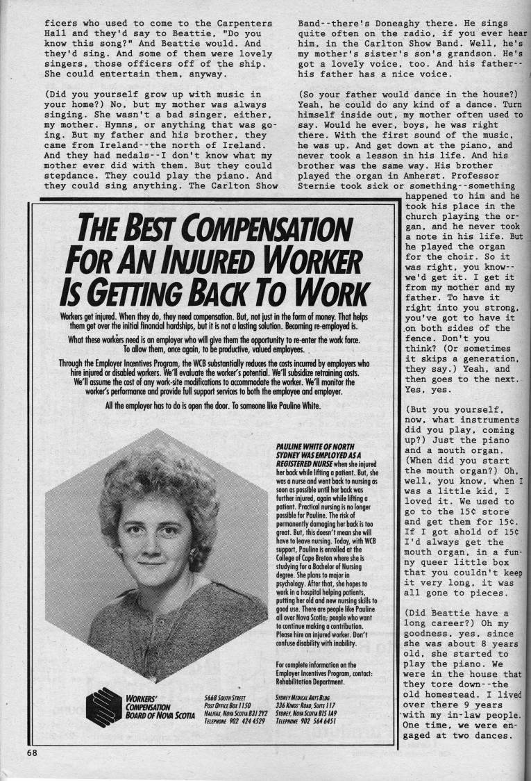 Published by Ronald Caplan on 1989/1/1 (159 reads)ficers who used to come to the Carpenters Hall and they'd say to Beattie, "Do you know this song?" And Beattie would. And they'd sing. And some of them were lovely singers, those officers off of the ship. She could entertain them, anyway. (Did you yourself grow up with music in your home?) No, but my mother was always singing. She wasn't a bad singer, either, my mother. Hymns, or anything that was go? ing. But my father and his brother, they came from Ireland--the north of Ireland. And they had medals--I don't know what my mother ever did with them. But they could stepdance. They could play the piano. And they could sing anything. The Carlton Show The Best COMPBmiON FORANimm WoRKBi ISGEmNGBACKTOWORK Woikers get injured. When they do, they need compensation. But, not just in the fomi of money. That helps them get over the initial finandal hardships, but it is not a lasting solution. Becoming re-employed is. What these wori<'rs need is an employer who will pive them the opportunity to re-enter the work force. To allow them, once ogain, to be productive, valued employees. . Through the Employer Incentives Program, the WCB substantially reduces the costs incurred by employers who hire injured or aisabled woikers. We'll evaluate the woiker's potential. We'll subsidize retraining costs. We'll assume the cost of any wori(-site modifications to accommodate the woricer. We'll monitor the woricer's performance and provide hill support services to both the employee and employer. All the employer has to do is open the door. To someone like Pauline White. Band--there's Doneaghy there. He sings quite often on the radio, if you ever hear him, in the Carlton Show Band. Well, he's my mother's sister's son's grandson. He's got a lovely voice, too. And his father-- his father has a nice voice. i (So your father would dance in the house?) Yeah, he could do any kind of a dance. Turn himself inside out, my mother often used to say. Would he ever, boys, he was right there. With the first sound of the music, he was up. And get down at the piano, and never took a lesson in his life. And his brother was the same way. His brother played the organ in Amherst. Professor Sternie took sick or something--something happened to him and he took his place in the church playing the or? gan, and he never took a note in his life. But he played the organ for the choir. So it was right, you know-- we'd get it. I get it from my mother and my father. To have it right into you strong, you've got to have it .on both sides of the fence. Don't you think? (Or sometimes it skips a generation, they say.) Yeah, and then goes to the next. Yes, yes. PAULINE WHITE OF NORTH SYDNEY WAS EMPLOYED AS A REGISTERED W[/ff5f when she injured her back while lifting a patient. But, she was a nurse and went back to nursing as soon as possible until her back was further injured, again while lifting a patient. Practical nursing is no longer possible for Pauline. The risk of permanently damaging her back is too great. But, this doesn't mean she will have to leave nursing. Today, with WCB support, Pauline is enrolled at the College of Cape Breton where she is studying for a Bachelor of Nursing degree. She plans to major in psychology. After that, she hopes to work in a hospital helping patients, putting her old and new nursing skills to good use. There are people like Pauline all over Nova Scotia; people who want to continue making a contribution. Please hire an injured worker. Don't confuse disability with inability. For complete information on the Employer Incentives Program, contact: Rehabilitation Department. WORKERS' 5668 South SrniCT SroHiYMcDiCAiAmBiBC. COMPBISATION PostOfficcBoxUSO 336 Kms'Road, Sum 117 BOMiD Of NOVA SCOTIA "'""''"' '"'"''* ''"' *'' ''' '''"''''' '"'' '"'"' *'' '''' lamoHi 902 4244529 Teiei>home 902 5646451 (But you yourself, now, what instruments did you play, coming up?) Just the piano and a mouth organ. (When did you start the mouth organ?) Oh, well, you know, when I was a little kid, I loved it. We used to go to the 15C store and get them for 15C. If I got ahold of 15C I'd always get the mouth organ, in a fun? ny queer little box that you couldn't keep it very long, it was all gone to pieces. (Did Beattie have a long career?) Oh my goodness, yes, since she was about 8 years old, she started to play the piano. We were in the house that they tore down--the old homestead. I lived over there 9 years with my in-law people. One time, we were en? gaged at two dances. J