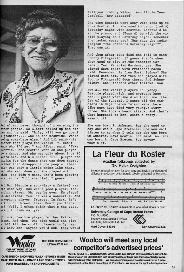 Published by Ronald Caplan on 1989/1/1 (190 reads)And Albert never thought of promising the other people. So Albert called up his sis? ter and he said, "Lily, will you go down? I promised.... And in the meantime, we're going somewhere else." And Lil said--his sister that plays the violin--"! don't know who I'd get." And Albert said, "Take Beattie." And Beattie went on and played to a dance. And she was only about 9 or 10 years old. And his sister (Lil) played the violin for the dance that was down there, rather than disappoint the people. (Beat- tie) was only a little thing like that, and she went down and she played with them. She didn't mind. She's been playing ever since. Till she died, I guess. And Bud (Gertie's son--Gary's father) was the same way. Bud was a good player, too, violin player. Oh, was he ever. He played in decisions. Yes, he was a wonderful. And saxophone player. Trumpet. In fact, it's all in our breed, like. Don't you think so? (Well, I often think that's the case, yes.) I think so, yes. (So now, Beattie played for her father first. And then, who else would she play with?) All the violin players in Sydney all know her. Anyone you'd ask, they would tell you. Johnny Wilmot. And little Tena Campbell (now deceased). One time Beattie went away with Tena up to Nova Scotia. And she used to be on (radio) Saturday night with Beattie. Beattie'd be at the piano, and (Tena'd) be with the vi? olin playing on a Saturday night. Remember the racket years ago? (Was that the radio program "The Cotter's Saturday Night"?) That was it. And then after Tena died she fell in with- Scotty Fitzgerald. (I guess that's when they used to play at the Venetian Gar? dens .) Yes. Venetian Gardens, yes. She played down there with Professor MacDo? nald. Remember him from North Sydney? She played with him. And then she played with Scotty Fitzgerald down there. And Johnny Wilmot, and--there's other fellows, now. But all the violin players in Sydney, Beattie played with. And everyone knew her. I guess when she died that time, the day of the funeral, I guess all the fid? dlers in Cape Breton Island were there. (She must have died very young.) Sixty- three. She took a heart attack. And that's what happened to her. Quite a story, wasn't it? She was born in Amherst. But she used to say she was a Cape Bretoner. She wouldn't listen to me when I told her she was born in Amherst, Nova Scotia. She said, no, she was born in Cape Breton. But anyway, that's it. La Fleur du Rosier Acadian folksongs collected by Dr. Helen Creighton Includes musical notation for each song and English translations of all lyrics. Introduction by Dr. Ronald Labelle, Universite de Moncton. '' hi J me toil iMi ?? I h ' ' j 'm * lone ?? temps que je t'li-me j* - meii ]e?' t'oa - Uie - rai. La Fleur du Rosier is available in local retail stores or trom: University College of Cape Breton Press P.O. Box 5300 Sydney, Nova Scotia B1P 6L2 Tel. (902) 539-5300 Ext. 146 Hard Cover: $39.95 Soft Cover: $24.95 USE OUR CONVENIENT LAYAWAY PLAN WooIco will meet any local competitor's advertised prices* CAPE BRETON SHOPPING PLAZA - SYDNEY RIVER MAYFLOWER MALL - GRAND LAKE ROAD - SYDNEY PORT HAWKESBURY SHOPPING CENTRE 'OTHERS SAY TT... WOOLCO GUARANTEES IT! Just bring In any Competitor's cun-ent Ad.. K our price on tlie identical item isnt already as low, or lower than their advertised price we will immediately meet their price! We exclude gimmick promotions (Scratch & Save), & entire Department, entire Store percentage otf Promotions. We reserve the right to limit quantities.