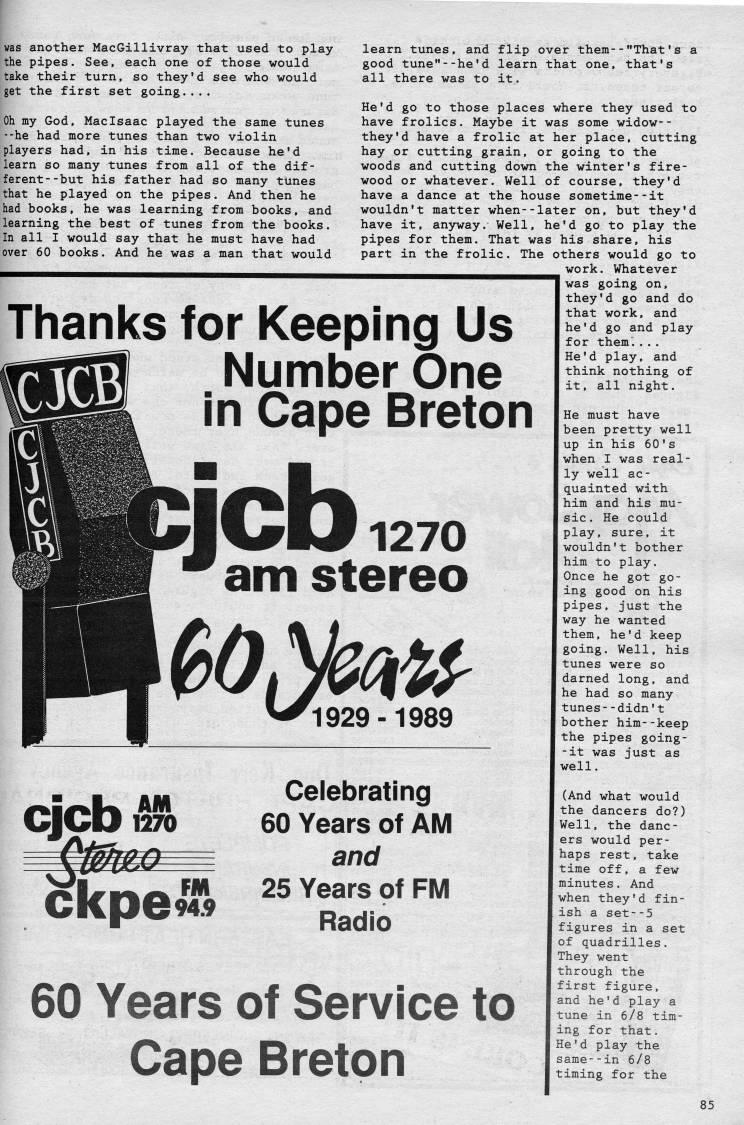 Published by Ronald Caplan on 1989/1/1 (172 reads)was another MacGillivray that used to play the pipes. See, each one of those would take their turn, so they'd see who would get the first set going.... Oh my God, Maclsaac played the same tunes --he had more tunes than two violin players had, in his time. Because he'd learn so many tunes from all of the dif? ferent- -but his father had so many tunes that he played on the pipes. And then he had books, he was learning from books, and learning the best of tunes from the books. In all I would say that he must have had over 60 books. And he was a man that would Thanks for Keeping Us Number One in Cape Breton jcb 1270 am stereo ''1929-1989 AM 1270 cjcb '0m ckpe FM 94.9 60 Years of Service to Cape Breton learn tunes, and flip over them--"That's a good tune"--he'd learn that one, that's all there was to it. He'd go to those places where they used to have frolics. Maybe it was some widow-- they'd have a frolic at her place, cutting hay or cutting grain, or going to the woods and cutting down the winter's fire? wood or whatever. Well of course, they'd have a dance at the house sometime--it wouldn't matter when--later on, but they'd have it, anyway. Well, he'd go to play the pipes for them. That was his share, his part in the frolic. The others would go to work. Whatever was going on, they'd go and do that work, and he'd go and play for them.... He'd play, and think nothing of it, all night. He must have been pretty well up in his 60's when I was real? ly well ac? quainted with him and his mu? sic. He could play, sure, it wouldn't bother him to play. Once he got go? ing good on his pipes, just the way he wanted them, he'd keep going. Well, his tunes were so darned long, and he had so many tunes--didn't bother him--keep the pipes going- -it was just as well. (And what would the dancers do?) Well, the danc? ers would per? haps rest, take time off, a few minutes. And when they'd fin? ish a set--5 figures in a set of quadrilles. They went through the first figure, and he'd play a tune in 6/8 tim? ing for that. He'd play the same--in 6/8 timing for the Celebrating 60 Years of AM and 25 Years of FM Radio 85