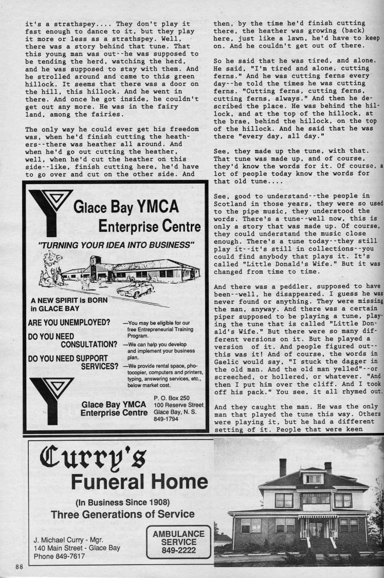 Published by Ronald Caplan on 1989/1/1 (161 reads)it's a strathspey.... They don't play it fast enough to dance to it, but they play it more or less as a strathspey. Well, there was a story behind that tune. That this young man was out--he was supposed to be tending the herd, watching the herd, and he was supposed to stay with them. And he strolled around and came to this green hillock. It seems that there was a door on the hill, this hillock. And he went in there. And once he got inside, he couldn't get out any more. He was in the fairy land, among the fairies. The only way he could ever get his freedom was, when he'd finish cutting the heath? ers- -there was heather all around. And when he'd go out cutting the heather, well, when he'd cut the heather oh this side--like, finish cutting here, he'd have to go over and cut on the other side. And ''Glace Bay YMCA I Enterprise Centre • TURNING YOUR IDEA INTO BUSINESS" mM A NEW SPIRIT is BORN in GLACE BAY ARE YOU UNEMPLOYED? DO YOU NEED CONSULTATION? DO YOU NEED SUPPORT W 1 -You may be eligible for our free Entrepreneurial Training Program. -We can help you develop and implement your business plan. SERVICES? • We provide rental space, pho? tocopier, computers and printers, typing, answering services, etc., ijelow market cost. P. O. Box 250 G lace Bay YMCA 10O Reserve street Enterprise Centre Q'ace Bay, n. s. 849-1794 then, by the time he'd finish cutting there, the heather was growing (back) here, just like a lawn, he'd have to keep on. And he couldn't get out of there. So he said that he was tired, and alone. He said, "I'm tired and alone, cutting ferns." And he was cutting ferns every day--he told the times he was cutting ferns. "Cutting ferns, cutting ferns, cutting ferns, always." And then he de? scribed the place. He was behind the hil? lock, and at the top of the hillock, at the brae, behind the hillock, on the top of the hillock. And he said that he was there "every day, all day." See, they made up the tune, with that. That tune was made up, and of course, they'd know the words for it. Of course, a lot of people today know the words for that old tune.... See, good to understand--the people in Scotland in those years, they were so used to the pipe music, they understood the words. There's a tune--well now, this is only a story that was made up. Of course, they could understand the music close enough. There's a tune today--they still play it--it's still in collections--you could find anybody that plays it. It's called "Little Donald's Wife." But it was changed from time to time. And there was a peddler, supposed to have been--well, he disappeared. I guess he was never found or anything. They were missing the man, anjrway. And there was a certain piper supposed to be playing a tune, play? ing the tune that is called "Little Don? ald's Wife." But there were so many dif? ferent versions on it. But he played a version of it. And people figured out-- this was it! And of course, the words in Gaelic would say, "I stuck the dagger in the old man. And the old man yelled"--or screeched, or hollered, or whatever. "And then I put him over the cliff. And I took off his pack." You see, it all rhymed out. And they caught the man. He was the only man that played the tune this way. Others were playing it, but he had a different setting of it. People that were keen • uvvfs Funeral Home (In Business Since 1908) Three Generations of Service J. Michael Curry - Mgr. 140 Main Street - Glace Bay Phone 849-7617 AMBULANCE SERVICE 849-2222