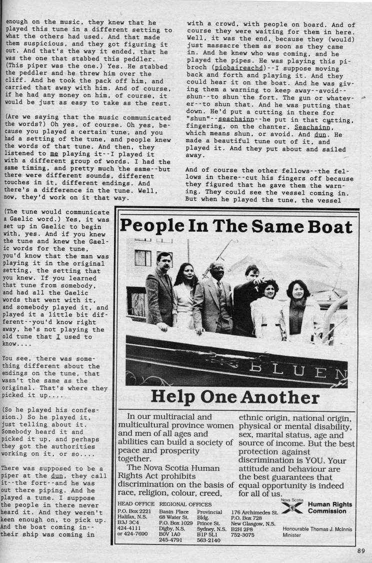 Published by Ronald Caplan on 1989/1/1 (175 reads)enough on the music, they knew that he played this tune in a different setting to what the others had used. And that made them suspicious, and they got figuring it out. And that's the way it ended, that he was the one that stabbed this peddler. (This piper was the one.) Yes. He stabbed the peddler and he threw him over the cliff. And he took the pack off him, and carried that away with him. And of course, if he had any money on him, of course, it would be just as easy to take as the rest. (Are we saying that the music communicated the words?) Oh yes, of course. Oh yes, be? cause you played a certain tune, and you had a setting of the tune, and people knew the words of that tune. And then, they listened to m?? playing it--I played it with a different group of words. I had the same timing, and pretty much the same--but there were different sounds, different touches in it, different endings. And there's a difference in the tune. Well, now, they'd work on it that way. with a crowd, with people on board. And of course they were waiting for them in here. Well, it was the end, because they (would) just massacre them as soon as they came in. And he knew who was coming, and he played the pipes. He was playing this pi? broch (piobaireachd)- -1 suppose moving back and forth and playing it. And they could hear it on the boat. And he was giv? ing them a warning to keep away--avoid-- shun--to shun the fort. The gun or whatev? er- -to shun that. And he was putting that down. He'd put a cutting in there for "shun"--seachainn--he put in that cutting, fingering, on the chanter. Seachainn. which means shun, or avoid. And dun. He made a beautiful tune out of it, and played it. And they put about and sailed away. And of course the other fellows--the fel? lows in there--cut his fingers off because they figured that he gave them the warn? ing. They could see the vessel coming in. But when he played the tune, the vessel (The tune would communicate a Gaelic word.) Yes, it was set up in Gaelic to begin with, yes. And if you knew the tune and knew the Gael? ic words for the tune, you'd know that the man was playing it in the original setting, the setting that you knew. If you learned that tune from somebody, and had all the Gaelic words that went with it, and somebody played it, and played it a little bit dif? ferent- -you'd know right away, he's not playing the old tune that 1 used to know.. . . You see, there was some? thing different about the endings on the tune, that wasn't the same as the original. That's where they picked it up.... (So he played his confes? sion.) So he played it, just telling about it. Somebody heard it and picked it up, and perhaps they got the authorities working on it, or so.... There was supposed to be a piper at the dun, they call it--the fort--and he was out there piping. And he played a tune. I suppose the people in there never heard it. And they weren't keen enough on, to pick up. And the boat coming in-- their ship was coming in People In The Same Boat Help One Another In our multiracial and ethnic origin, national origin, multicultural province women physical or mental disability, and men of all ages and sex, marital status, age and abilities can build a society of source of income. But the best peace and prosperity protection against together. discrimination is YOU. Your The Nova Scotia Human attitude and behaviour are Rights Act prohibits the best guarantees that discrimination on the basis of equal opportunity is indeed race, religion, colour, creed, for all of us. HEAD OFFICE REGIONAL OFFICES P.O. Box 2221 Basin Place Provincial 176 Archimedes St, Halifax, N.S. 68 Water St. BIdg. P.O. Box 728 B3J3C4 P.O. Box 1029 Prince St. New Glasgow, N.S. 424-4111 Digby. N.S. Sydney. N.S. B2H 2P8 or 424-7690 BOY lAO B1P5L1 752-3075 245-4791 563-2140 ' ' Human Rights 'isi' Commission Honourable Thomas J. Mclnnis Minister