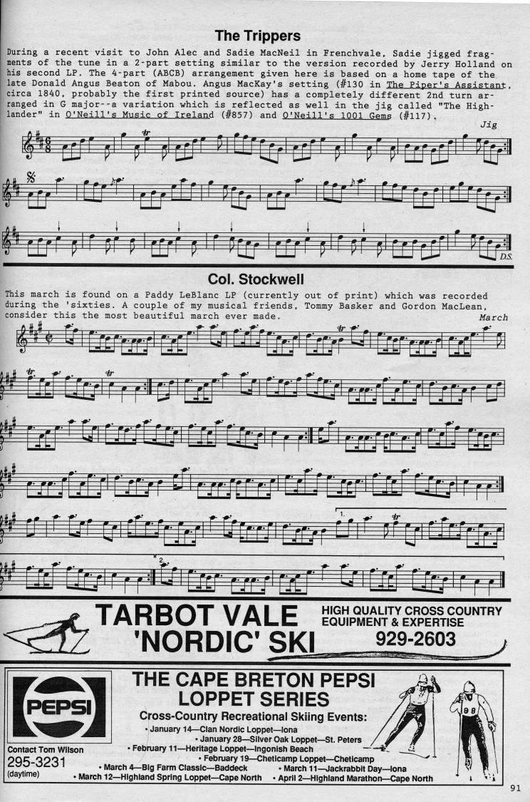 Published by Ronald Caplan on 1989/1/1 (265 reads)The Trippers During a recent visit to John Alec and Sadie MacNeil in Frenchvale, Sadie jigged frag? ments of the tune in a 2-part setting similar to the version recorded by Jerry Holland on his second LP. The 4-part (ABCB) arrangement given here is based on a home tape of the late Donald Angus Beaton of Mabou. Angus MacKay's setting (#130 in The Piper's Assistant. circa 1840, probably the first printed source) has a completely different 2nd turn ar? ranged in G major--a variation which is reflected as well in the jig called "The High? lander" in O'Neill's Music of Ireland (#857) and O'Neill's 1001 Gems (#117). Jig Col. Stockwell This march is found on a Paddy LeBlanc LP (currently out of print) which was recorded during the 'sixties. A couple of my musical friends. Tommy Basker and Gordon MacLean, consider this the most beautiful march ever made. March TARBOT VALE 'NORDIC SKI HIGH QUALITY CROSS COUNTRY EQUIPMENT & EXPERTISE 929-2603 THE CAPE BRETON PEPSI LOPPET SERIES Cross-Country Recreational Skiing Events • January 14 • Clan Nordic Loppet • lona • January 28 • Silver Oak Loppet • St. Peters February 11 • Heritage Loppet • Ingonish Beach • - • February 19 • Cheticamp Loppet • Cheticamp IVlarch 4 • Big Farm Classic • Baddeck • March 11 • Jackrabbit Day • lona April 2 • Highland Marathon • Cape North Contact Tom Wilson 295-3231 (daytime) • Match 12 • Highland Spring Loppet • Cape North