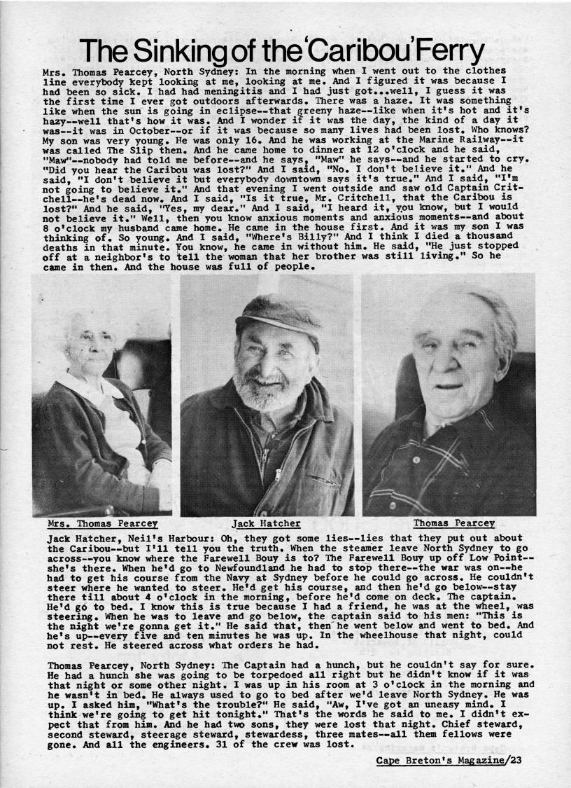 Published by Ronald Caplan on 1975/3/31 (6516 reads)The Sinking of the'Caribou'Ferry Mrs. Thomas Pearcey, North Sydney: In the morning when I went out to the clothes line everybody kept looking at me, looking at me. And I figured it was because I had been so sick. I had had meningitis and I had just got...well, I guess it was the first time I ever got outdoors afterwards. There was a haze. It was something like when the sun is going in eclipse • that greeny haze • like when it*s hot and it*s hazy • well that's how it was. And I wonder if it was the day, the kind of a day it was • it was in October • or if it was because so many lives had been lost. Who knows? My son was very young. He was only 16. And he was working at the Marine Railway • it was called The Slip then. And he came home to dinner at 12 o'clock and he said, "Maw** • nobody had told me before • and he says, "Maw" he says • and he started to cry. • • Did you hear the Caribou was lost?" And I said, • • No. I don't believe it." And he said, "I don*t believe it but everybody downtown says it*s true." And I said, ''I'm not going to believe it.*' And that evening I went outside and saw old Captain Crit- chell • he*s dead now. And I said, • • Is it true, Mr. Critchell, that the Caribou is lost?" And he said, "Yes, my dear." And I said, • • I heard it, you know, but I would not believe it." Well, then you know anxious moments and anxious moments • and about 8 o'clock my husband came home. He came in the house first. And it was my son I was thinking of. So young. And I said, ' • Where's Billy?** And I think I died a thousand deaths in that minute. You know, he came in without him. He said, • 'He just stopped off at a neighbor's to tell the woman that her brother was still living." So he came in then. And the house was full of people. Mrs. Thomas Pearcey Jack Hatcher tliomas Pearcey Jack Hatcher, Neil's Harbour: Oh, they got some lies • lies that they put out about the Caribou • but I'll tell you the truth. When the steamer leave North Sydney to go across • you know where the Farewell Bouy is to? Hie Farewell Bouy up off Low Point- she's there. When he'd go to Newfoundland he had to stop there • the war was on • he had to get his course from the Navy at Sydney before he could go across. He couldn't steer where he wanted to steer. He'd get his course, and then he'd go below • stay there till about 4 o'clock in the morning, before he'd come on deck. The captain. He'd gd to bed. I know this is true because I had a friend, he was at the wheel, was steering. When he was to leave and go below, the captain said to his men: "This is the night we're gonna get it." He said that, then'he went below and went to bed. And he's up • every five and ten minutes he was up. In the wheelhouse that night, could not rest. He steered across what orders he had. Thomas Pearcey, North Sydney: The Captain had a himch, but he couldn*t say for sure. He had a hunch she was going to be torpedoed all right but he didn't know if it was that night or some other night. I was up in his room at 3 o'clock in the morning and he wasn't in bed. He always used to go to bed after we*d leave North Sydney. He was up. I asked him, • • What's the trouble?" He said, '*Aw, I've got an imeasy mind. I think we're going to get hit tonight." That's the words he said to me. I didn't ex? pect that from him. And he had two sons, they were lost that night. Chief steward, second steward, steerage steward, stewardess, three mates • all them fellows were gone. And all the engineers. 31 of the crew was lost. Cape Breton's Magazine/23