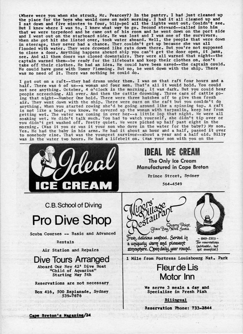 Published by Ronald Caplan on 1975/3/31 (1023 reads)(Where were you when she struck, Mr. Pearcey?) In the pantry. I had just cleaned up the place for the boys who would come on next morning. I had it all cleaned up and I sat down and five minutes to four, blip-poj all the lights went out. Couldn't see. But I knew where I was to, I knew what way to go. Second steward • called into him that we were torpedoed and he came out of his room and he went down on the port side and I went out on the starboard side. He was lost and I was one of the survivors. When she got hit she listed over, took water aboard. Well, the people that were down in steerage, they never had a chance. They couldn't get up because she was all flooded with water. They were drowned like rats down there. But you*re not supposed to close a door. Anything happens aboiard ship you can*t get the door open, it jams, see. And all them doors was closed downstairs. They were all warned that night • the captain warned them • be ready for the lifeboats and keep their clothes on, don't take off their clothes. He had an idea. He could have been saved • the captain could. He could have gone with Tommy Flemming. But no, he went down with the ship. There was no need of it. There was nothing he could do. I got out on a raft • they had drums under them. I was on that raft four hours and a half. There was 6 of us • a woman and four men. That's all it would hold. You could not see anything. October, 4 o'clock in the morning, it was dark. But you could hear people screeching. All over. And then the cattle drowning. Three cars of cattle go? ing that night • Number One hold. There were three hatches off to give them fresh air. They went down with the ship. There were oars on the raft but you couldn't do anything. When you started rowing she'd be going around like a spinning top. A raft is not like a boat, you know. V/e covered up the woman with tarpaulin, keep her from getting wet. The water was coming in over her • a little lop that night. We were all soaking wet. We didn't talk much. You had to watch yourself, she didn't tip over or you didn't get washed off. Pretty quiet. V'e were picked up half past eight in the morning. (Was it you or was it your son who dove in the water for the baby?) My son. Yes. He had the baby in his arms. He had it about an hour and a half, passed it over to somebody else. That was the youngest survivor • about a year and a half old. Billy was in the water two hours. He had a lifebelt on. (Was your son with you on the IDEAL ICE CREAM The Only Ice Cream Manufactured in Cape Breton Prince Street, Sydney 564-4549 C.B.School of Diving Pro Dive Shop Scuba Courses • Basic and Advanced Rentals Air Station and Rejpairs Dive Tours Arranged Aboard Our New 42? Dive Boat "Child of Aquarius" Starting May 5th Reservations are not necessary Box 416, 500 Esplanade, Sydney 539-7676 (Upe Breton's Mig??zine/24 r?.'(50 Jrcfili, ddicious seafood. S'n?cd ixi 1 Mile from Fortress Louisbourg Nat. Park FleurdeLis Motor Inn We serve 3 meals a day and Specialize in Fresh Fish Bilingual Reservation Phone: 733-2844