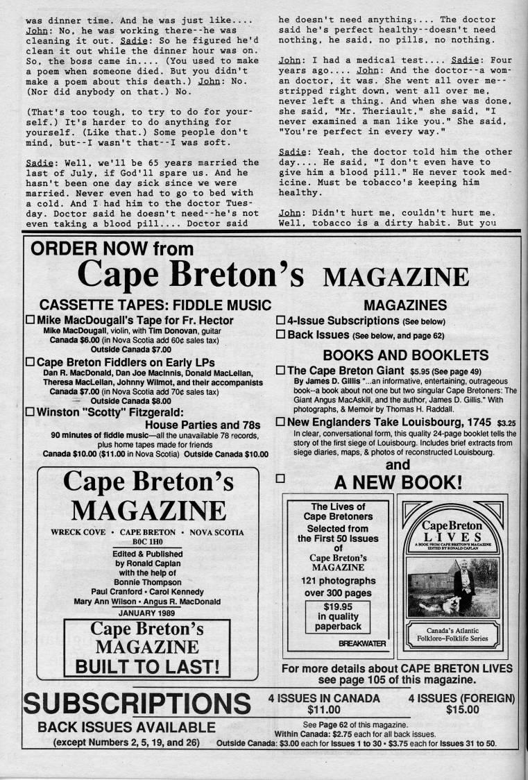 Published by Ronald Caplan on 1989/1/1 (161 reads)was dinner time. And he was just like.... John: No, he was working there--he was cleaning it out. Sadie: So he figured he'd clean it out while the dinner hour was on. So, the boss came in.... (You used to make a poem when someone died. But you didn't make a poem about this death.) John: No. (Nor did anybody on that.) No. (That's too tough, to try to do for your? self.) It's harder to do anything for yourself. (Like that.) Some people don't mind, but--I wasn't that--I was soft. Sadie: Well, we'll be 65 years married the last of July, if God'11 spare us. And he hasn't been one day sick since we were married. Never even had to go to bed with a cold. And I had him to the doctor Tues? day. Doctor said he doesn't need--he's not even taking a blood pill.... Doctor said he doesn't need anything'... The doctor said he's perfect healthy--doesn't need nothing, he said, no pills, no nothing. John: I had a medical test.... Sadie: Four years ago.... John: And the doctor--a wom? an doctor, it was. She went all over me-- stripped right down, went all over me, never left a thing. And when she was done, she said, "Mr. Theriault," she said, "I never examined a man like you." She said, "You're perfect in every way." Sadie: Yeah, the doctor told him the otlier day.... He said, "I don't even have to give him a blood pill." He never took med? icine. Must be tobacco's keeping him healthy. John; Didn't hurt me, couldn't hurt me. Well, tobacco is a dirty habit. But you ORDER NOW from Cape Breton's magazine CASSETTE TAPES: FIDDLE MUSIC D Mike MacDougall's Tape for Fr. Hector Mike MacDougall, violin, with Tim Donovan, guitar Canada $6.00 (in Nova Scotia add 600 sales tax) Outside Canada $7.00 D Cape Breton Fiddlers on Early LPs Dan R. MacDonald, Dan Joe Maclnnis, Donald MacLellan, Theresa MacLellan, Johnny Wilmot, and their accompanists Canada $7.00 (in Nova Scotia add 700 sales tax) - Outside Canada $8.00 D Winston "Scotty" Fitzgerald: House Parties and 78s 90 minutes of fiddle music • all the unavailable 78 records, plus home tapes made for friends Canada $10.00 ($11.00 in Nova Scotia) Outside Canada $10.00 Cape Breton's MAGAZINE WRECK COVE CAPE BRETON BOC IHO NOVA SCOTIA Edited & Published by Ronald Caplan with the help of Bonnie Thompson Paul Cranford • Carol Kennedy Mary Ann Wilson?Angus R. MacDonald JANUARY 1989 Cape Breton's MAGAZINE BUILT TO LAST! MAGAZINES D 4-lssue Subscriptions (See beiow) D Back Issues (See below, and page 62) BOOKS AND BOOKLETS DThe Cape Breton Giant $5.95 (See page49) By James D. Gillis "...an informative, entertaining, outrageous book--a book about not one but two singular Cape Bretoners: The Giant Angus MacAskill, and the author, James D. Gillis." With photographs, & Memoir by Thomas H. Raddall. D New Englanders Take Louisbourg, 1745 $3.25 In clear, conversational form, this quality 24-page booklet tells the story of the first siege of Louisbourg. Includes brief extracts from siege diaries, maps, & photos of reconstructed Louisbourg. and ? A NEW BOOK! The Lives of Cape Bretoners Selected from the First 50 Issues of Cape Breton's MAGAZINE 121 photographs over 300 pages $19.95 In quality paperback SUBSCRIPTIONS For more details about CAPE BRETON LIVES see page 105 of this magazine. 4 ISSUES (FOREIGN) $15.00 4 ISSUES IN CANADA $11.00 BACK ISSUES AVAILABLE see page 62 of this magazine Di'v'rx tK9