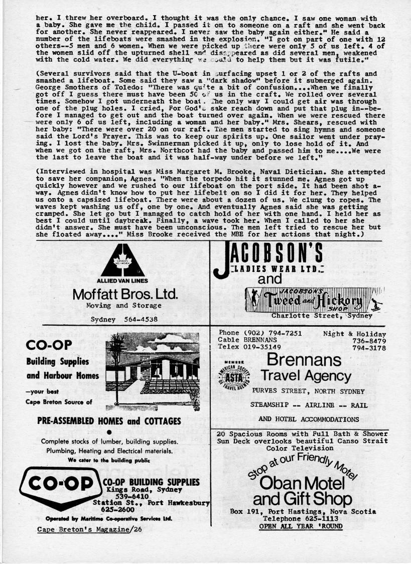Published by Ronald Caplan on 1975/3/31 (752 reads)her. I threw her overboard. I thotight it was thfe only chance. I saw one woman with a baby. She gave me the child. I passed it on to someone on a raft and she went back for another. She never reappeared. I never saw the baby again either.** He said a number of the lifeboats were smashed in the explosion. "I got on part of one with 12 others • 5 men and 6 women. When we were picked up lliere were only 5 of us left. 4 of the women slid off the upturned shell