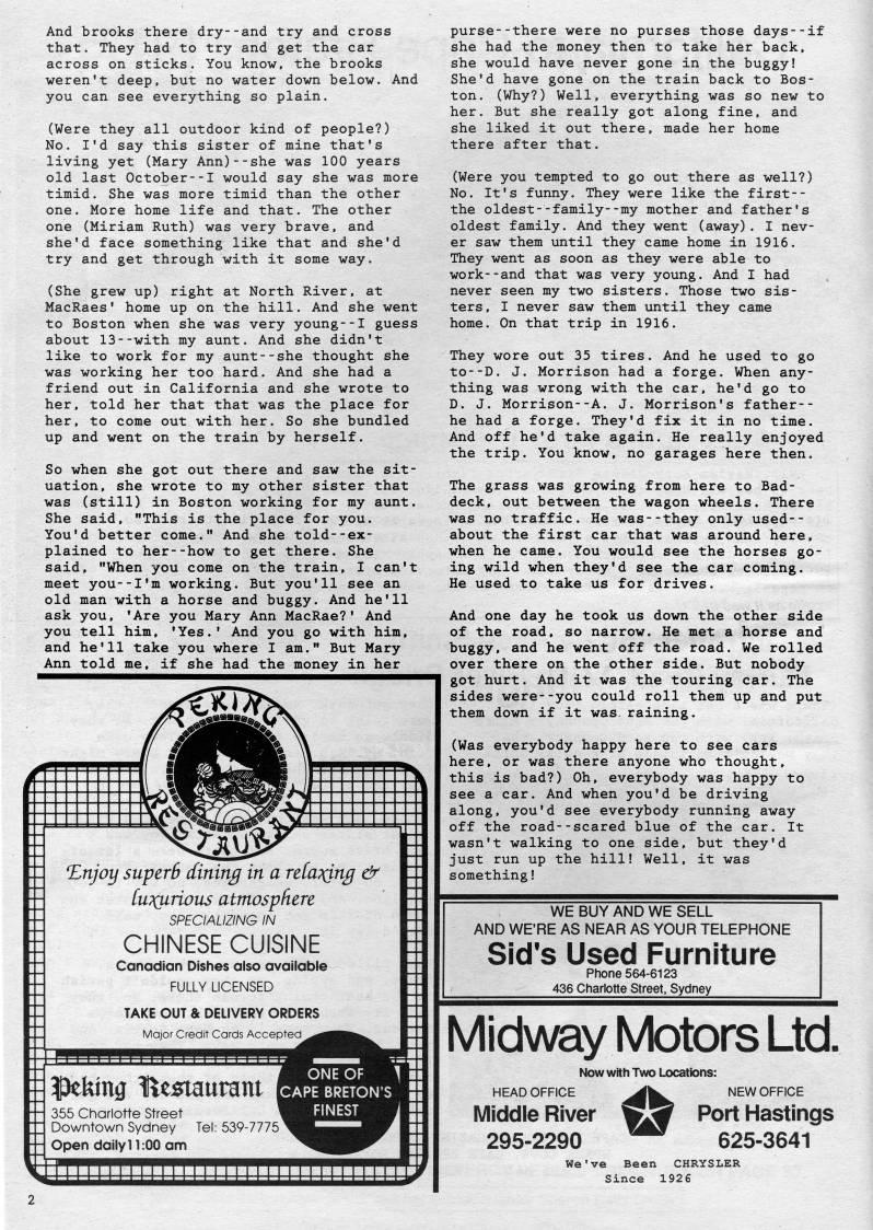 Published by Ronald Caplan on 1989/2/1 (332 reads)And brooks there dry--and try and cross that. They had to try and get the car across on sticks. You know, the brooks weren't deep, but no water down below. And you can see everything so plain. (Were they all outdoor kind of people?) No. I'd say this sister of mine that's living yet (Mary Ann)--she was 100 years old last October--! would say she was more timid. She was more timid than the other one. More home life and that. The other one (Miriam Ruth) was very brave, and she'd face something like that and she'd try and get through with it some way. (She grew up) right at North River, at MacRaes' home up on the hill. And she went to Boston when she was very young--I guess about 13--with my aunt. And she didn't like to work for my aunt--she thought she was working her too hard. And she had a friend out in California and she wrote to her, told her that that was the place for her, to come out with her. So she bundled up and went on the train by herself. So when she got out there and saw the sit? uation, she wrote to my other sister that was (still) in Boston working for my aunt. She said, "This is the place for you. You'd better come." And she told--ex? plained to her--how to get there. She said, "When you come on the train, I can't meet you--I'm working. But you'll see an old man with a horse and buggy. And he'll ask you, 'Are you Mary Ann MacRae?' And you tell him, 'Yes.' And you go with him, and he'll take you where I am." But Mary Ann told me, if she had the money in her HS %njoy superB dining in a rtlaTQng & luTQirious atmosphere SPECIALIZING IN CHINESE CUISINE Canadian Dishes also available FULLY LICENSED TAKE OUT & DELIVERY ORDERS Major Credit Cards Accepted 'king Restaurant 355 Charlotte Street Downtown Sydney Tel: 539-7775 Open daily 11:00 am ONE OF } 11 CAPE BRETON'S Si FINEST i • ? im IIIII IIIIIII purse--there were no purses those days--if she had the money then to take her back, she would have never gone in the buggy! She'd have gone on the train back to Bos? ton. (Why?) Well, everything was so new to her. But she really got along fine, and she liked it out there, made her home there after that. (Were you tempted to go out there as well?) No. It's funny. They were like the first-- the oldest--family--my mother and father's oldest family. And they went (away). I nev? er saw them until they came home in 1916. They went as soon as they were able to work--and that was very young. And I had never seen my two sisters. Those two sis? ters, I never saw them until they came home. On that trip in 1916. They wore out 35 tires. And he used to go to--D. J. Morrison had a forge. When any? thing was wrong with the car, he'd go to D. J. Morrison--A. J. Morrison's father-- he had a forge. They'd fix it in no time. And off he'd take again. He really enjoyed the trip. You know, no garages here then. The grass was growing from here to Bad- deck, out between the wagon wheels. There was no traffic. He was--they only used-- about the first car that was around here, when he came. You would see the horses go? ing wild when they'd see the car coming. He used to take us for drives. And one day he took us down the other side of the road, so narrow. He met a horse and buggy, and he went off the road. We rolled over there on the other side. But nobody got hurt. And it was the touring car. The sides were--you could roll them up and put them down if it was. raining. (Was everybody happy here to see cars here, or was there anyone who thought, this is bad?) Oh, everybody was happy to see a car. And when you'd be driving along, you'd see everybody running away off the road--scared blue of the car. It wasn't walking to one side, but they'd just run up the hill! Well, it was something! WE BUY AND WE SELL AND WERE AS NEAR AS YOUR TELEPHONE Sid*s Used Furniture Phone 564-6123 436 Charlotte Street, Sydney Midway Motors Ltd. Now with Two Locations: HEAD OFFICE '' NEW OFFICE Middle River wS Port Hastings 295-2290 "' 625-3641 We've Been CHRYSLER Since 1926