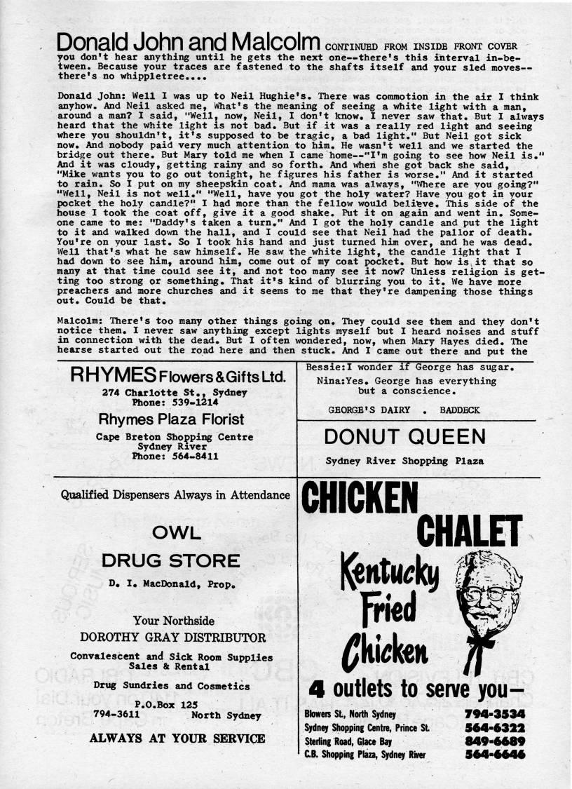 Published by Ronald Caplan on 1975/3/31 (1195 reads)Donald John and Malcolm CONTINUED FROM INSIDE FRONT COVER you don't hear anything until he gets the next one • there's this interval in-be? tween. Because your traces are fastened to the shafts itself and your sled moves- there 's no whippletree.... Donald John: Well I was up to Neil Hughie's. There was commotion in the air I think anyhow. And Neil asked me. What's the meaning of seeing a white light with a man, around a man? I said, "Well, now, Neil, I don't know. I never saw that. But I always heard that the white light is not bad. But if it was a really red light and seeing where you shouldn't, it's supposed to be tragic, a bad light." But Neil got sick now. And nobody paid very much attention to him. He wasn't well and we started the bridge out there. But Mary told me when I came home • "I'm going to see how Neil is." And it was cloudy, getting rainy and so forth. And when she got back she said, "Mike wants you to go out tonight, he figures his father is worse." And it started to rain. So I put on my sheepskin coat. And mama was always, "Where are you going?" "Well, Neil is not well." "Well, have you got the holy water? Have you got in your pocket the holy candle?" I had more than the fellow would belifeve. This side of the house I took the coat off, give it a good shake. Put it on again and went in. Some? one came to me: "Daddy's taken a turn." And I got the holy candle and put the light to it and walked down the hall, and I could see that Neil had the pallor of death. You're on your last. So I took his hand and just turned him over, and he was dead. Well that's what he saw himself. He saw the white light, the candle light that I had down to see him, around him, come out of my coat pocket. But how is it that so many at that time could see it, and not too many see it now? Unless religion is get? ting too strong or something. That it's kind of blurring you to it. We have more preachers and more churches and it seems to me that they're dampening those things out. Could be that. Malcolm: There's too many other things going on. They could see them and they don't notice them. I never saw anything except lights myself but I heard noises and stuff in connection with the dead. But I often wondered, now, when Mary Hayes died. The hearse started out the road here and then stuck. And I came out there and put the Bessie:I wonder if George has sugar. Nina:Yes. George has everything but a conscience. GEORGE'S DAIRY . BADDECK RHYMES Flowers &Gif; ts Ltd. 274 Charlotte St., Sydney Phone: 539-1214 Rhymes Plaza Florist Cape Breton Shopping Centre Sydney River Phone: 564-8411 DONUT QUEEN Sydney River Shopping Plaza Qualified Dispensers Alvi'ays in Attendance OWL DRUG STORE D* I* MacDonald, Prop. Your Northside DOROTHY GRAY DISTRIBUTOR Convalescent and Sick Room Supplies Sales & Rental Drug Sundries and Cosmetics P.O.Box 125 794-3611 North Sydney ALWAYS AT YOUR SERVICE CHICKEN CHALET jrid 4 outlets to serve you- Bloweis SI, North Sydney Sydney Shopping Centre, Prince SL Sterling Road, Glace Bay CB. Shopping Plaza, Sydney River 794-3534 564-6322 849-6689 564-6646