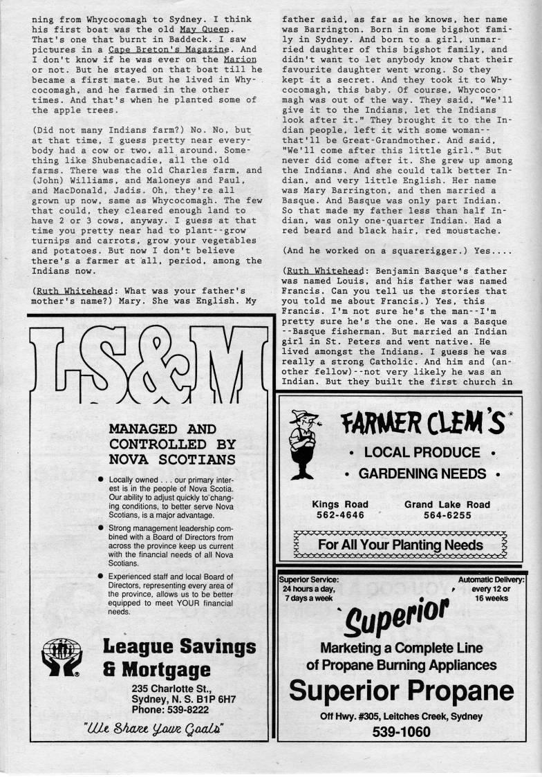 Published by Ronald Caplan on 1989/2/1 (434 reads)ning from Whycocomagh to Sydney. I think his first boat was the old May Queen. That's one that burnt in Baddeck. I saw pictures in a Cape Breton's Magazine. And I don't know if he was ever on the Marion or not. But he stayed on that boat till he became a first mate. But he lived in Why? cocomagh, and he farmed in the other times. And that's when he planted some of the apple trees. (Did not many Indians farm?) No. No, but at that time, I guess pretty near every? body had a cow or two, all around. Some? thing like Shubenacadie, all the old farms. There was the old Charles farm, and (John) Williams, and Maloneys and Paul, and MacDonald, Jadis. Oh, they're all grown up now, same as Whycocomagh. The few that could, they cleared enough land to have 2 or 3 cows, anyway. I guess at that time you pretty near had to plant--grow turnips and carrots, grow your vegetables and potatoes. But now I don't believe there's a farmer at all, period, among the Indians now. (Ruth Whitehead: What was your father's mother's name?) Mary. She was English. My ro MANAGED AND CONTROLLED BY NOVA SCOTIANS • Locally owned ... our primary inter? est is in the people of Nova Scotia. Our ability to adjust quickly to chang? ing conditions, to better serve Nova Scotians, is a major advantage. • Strong management leadership com? bined with a Board of Directors from across the province keep us current with the financial needs of all Nova Scotians. • Experienced staff and local Board of Directors, representing every area of the province, allows us to be better equipped to meet YOUR financial needs. League Savings & Mortgage 235 Charlotte St., Sydney, N.S. 81P6H7 Phone: 539-8222 "UJLt Shcuzt 'Jjw/t QaaJM' father said, as far as he knows, her name was Barrington. Born in some bigshot fami? ly in Sydney. And born to a girl, unmar? ried daughter of this bigshot family, and didn't want to let anybody know that their favourite daughter went wrong. So they kept it a secret. And they took it to Why? cocomagh, this baby. Of course, Whycoco? magh was out of the way. They said, "We'll give it to the Indians, let the Indians look after it." They brought it to the In? dian people, left it with some woman-- that'll be Great-Grandmother. And said, "We'll come after this little girl." But never did come after it. She grew up among the Indians. And she could talk better In? dian, and very little English. Her name was Mary Barrington, and then married a Basque. And Basque was only part Indian. So that made my father less than half In? dian, was only one-quarter Indian. Had a red beard and black hair, red moustache. (And he worked on a squarerigger.) Yes.... (Ruth Whitehead: Benjamin Basque's father was named Louis, and his father was named Francis. Can you tell us the stories that you told me about Francis.) Yes, this Francis. I'm not sure he's the man--I'm pretty sure he's the one. He was a Basque --Basque fisherman. But married an Indian girl in St. Peters and went native. He lived amongst the Indians. I guess he was really a strong Catholic. And him and (an? other fellow)--not very likely he was an Indian. But they built the first church in . LOCAL PRODUCE • • GARDENING NEEDS • Kings Road 562-4646 Grand Lake Road 564-6255 For All Your Planting Needs Superior Service: 24 hours a day, 7 days a week Automatic Delivery: every 12 or 16 weeks Marketing a Complete Line of Propane Burning Appliances Superior Propane Off Hwy. #305, Leitches Creek, Sydney 539-1060