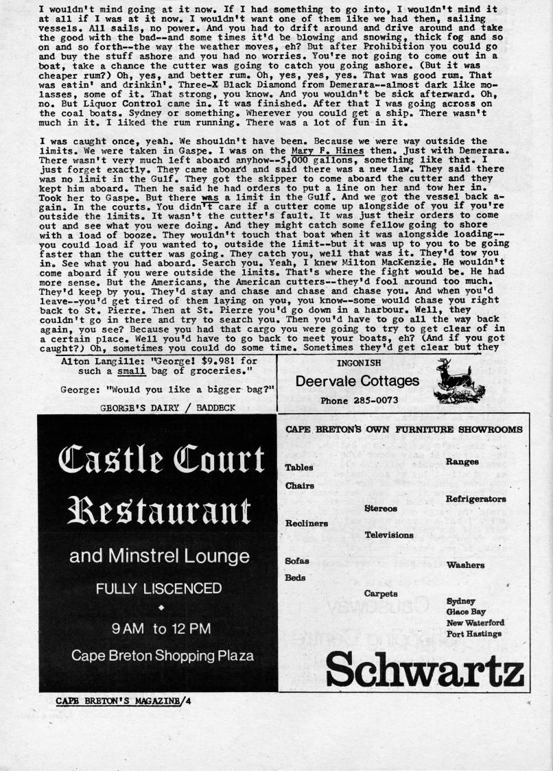 Published by Ronald Caplan on 1975/6/1 (519 reads)I wouldn't mind going at it now* If I had something to go into, I wouldn't mind it at all if I was at it now. I wouldn't want one of them like we had then, sailing vessels. All sails, no power. And you had to drift around and drive around and take the good with the bad • and some times it'd be blowing and snowing, thick fog and so on and so forth • the way the weather moves, eh? But after Prohibition you could go and buy the stuff ashore and you had no worries. You're not going to come out in a boat, take a chance the cutter was going to catch you going ashore. (But it was cheaper rum?) Oh, yes, and better rura. Oh, yes, yes, yes. That was good rura. That was eatin' and drinkin'. Three-X Black Diamond from Demerara • almost dark like mo? lasses, some of it. That strong, you know. And you wouldn't be sick afterward. Oh, no. But Liquor Control came in. It was finished. After that I was going across on the coal boats. Sydney or something* Wherever you could get a ship. There wasn't much in it. I liked the rura running. There was a lot of fun in it* I was caxight once, yeah. We shouldn't have been. Because we were i'ay outside the limits. We were taken in Gaspe. I was on the Mary F. Hines then. Just with Demerara. There wasn't very much left aboard anyhow • 5,000 gallons, something like that. I just forget exactly. They came aboard and said there was a new law. They said there was no limit in the Gulf. They got the skipper to corae aboard the cutter and they kept him aboard. Then he said he had orders to put a line on her and tow her in. Took her to Gaspe. But there was a limit in the Gulf. And we got the vessel back a- gain. In the courts. You didn't care if a cutter come up alongside of you if you're outside the limits. It wasn't the cutter's fault. It was just their orders to come out and see what you were doing. And they might catch sorae fellow going to shore with a load of booze. They wouldn't touch that boat when it was alongside loading • you could load if you wanted to, outside the limit • but it was up to you to be going faster than the cutter was going. They catch you, well that was it. They'd tow you in. See what you had aboard. Search you* Yeah, I knew Milton MacKenzie* He wouldn't come aboard if you were outside the limits* That's where the fight would be* He had more sense. But the Americans, the American cutters • they'd fool around too much. They'd keep by you. They'd stay and chase and chase and chase you. And when you'd leave • you'd get tired of them laying on you, you know • some would chase you right back to St. Pierre. Then at St. Pierre you'd go down in a harbour* Well, they couldn't go in there and try to search you. Then you'd have to go all the way back again, you see? Because you had that cargo you were going to try to get clear of in a certain place. Well you'd have to go back to meet your boats, eh? (And if you got caught?) Oh, sometimes you could do sorae time. Sometimes they'd get clear but they Alton Langille: "George! $9*981 for such a small bag of groceries*" George: "Would you like a bigger bag?* GEORGE'S DAIRY / BADDECK Casitle Court 3RE??!taurant and Minstrel Lounge FULLY LISCENCED 9 AM to 12 PM Cape Breton Shopping Plaza CAEB BRETON'S MAGA2INB/4 INGONISH Deervale Cottages Phone 285-0073 CAPE BRETONfe OWN FURNITUBE SHOWROOMS Tables Chairs Recliners Sofas Beds Stereos Televisions Carpets Ranges Refrigerators Washers Sj'dney (H • U??B Bay New Waterford Port Hastings Schwartz
