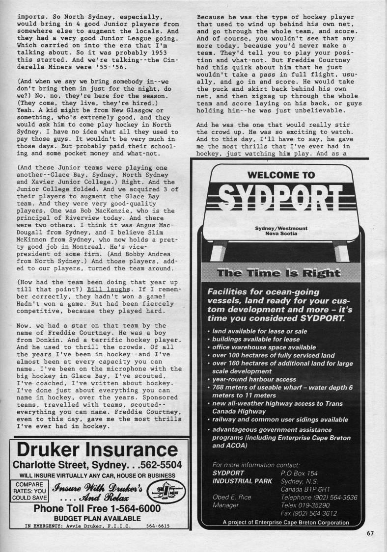 Published by Ronald Caplan on 1989/2/1 (228 reads)imports. So North Sydney, especially, would bring in 4 good Junior players from somewhere else to augment the locals. And they had a very good Junior League going. Which carried on into the era that I'm talking about. So it was probably 1953 this started. And we're talking--the Cin? derella Miners were '55-'56. (And when we say we bring somebody in--we don't bring them in just for the night, do we?) No, no, they're here for the season. (They come, they live, they're hired.) Yeah. A kid might be from New Glasgow or something, who's extremely good, and they would ask him to come play hockey in North Sydney. I have no idea what all they used to pay those guys. It wouldn't be very much in those days. But probably paid their school? ing and some pocket money and what-not. (And these Junior teams were playing one another--Glace Bay, Sydney, North Sydney and Xavier Junior College.) Right. And the Junior College folded. And we acquired 3 of their players to augment the Glace Bay team. And they were very good-quality players. One was Bob MacKenzie, who is the principal of Riverview today. And there were two others. I think it was Angus Mac? Dougall from Sydney, and I believe Slim McKinnon from Sydney, who now holds a pret? ty good job in Montreal. He's vice- president of some firm. (And Bobby Andrea from North Sydney.) And those players, add? ed to our players, turned the team around. (How had the team been doing that year up till that point?) Bill laughs. If I remem? ber correctly, they hadn't won a game! Hadn't won a game. But had been fiercely competitive, because they played hard. Now, we had a star on that team by the name of Freddie Courtney. He was a boy from Donkin. And a terrific hockey player. And he used to thrill the crowds. Of all the years I've been in hockey--and I've almost been at every capacity you can name. I've been on the microphone with the big hockey in Glace Bay, I've scouted, I've coached, I've written about hockey. I've done just about everything you can name in hockey, over the years. Sponsored teams, travelled with teams, scouted-- everything you can name. Freddie Courtney, even to this day, gave me the most thrills I've ever had in hockey. Druker Insurance Charlotte Street, Sydney.. .562-5504 WILL INSURE VIRTUALLY ANY CAR, MOUSE OR BUSINESS COMPARE RATES: YOU COULD SAVE Phone Toll Free 1-564-6000 BUDGET PLAN AVAILABLE IN EMERGENCY: Avvie Druker. F.I.I.C. 564-6615 Because he was the type of hockey player that used to wind up behind his own net, and go through the whole team, and score. And of course, you wouldn't see that any more today, because you'd never make a team. They'd tell you to play your posi? tion and what-not. But Freddie Courtney had this quirk about him that he just wouldn't take a pass in full flight, usu? ally, and go in and score. He would take the puck and skirt back behind his own net, and then zigzag up through the whole team and score laying on his back, or guys holding him--he was just unbelievable. And he was the one that would really stir the crowd up. He was so exciting to watch. And to this day, I'll have to say, he gave me the most thrills that I've ever had in hockey, just watching him play. And as a WELCOME TO mm 'A Sydney/Westmount Nova Scotia a mCr I isnc' wS' iHcmssnm facilities for ocean-going vessels, land ready for your cus? tom development and more - It's time you considered SYDPORT. • land available for lease or sale • buildings available for lease • office warehouse space available • over 100 hectares of fully serviced land • over 160 hectares of additional land for large scale development • year-round harbour access • 768 meters of useable wharf- water depths meters to 11 meters • new all-weather highway access to Trans Canada Highway ' railway and common user sidings available • advantageous government assistance programs (including Enterprise Cape Breton and ACOA) SYDPORT INDUSTRIAL PARK 3 Cape Breton Corporation 67