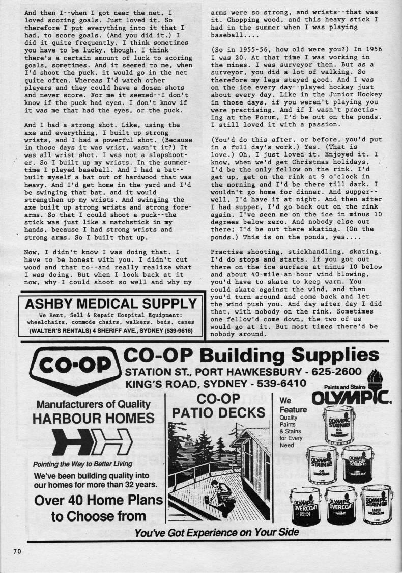 Published by Ronald Caplan on 1989/2/1 (191 reads)And then I--when I got near the net, I loved scoring goals. Just loved it. So therefore I put everything into it that I had, to score goals. (And you did it.) I did it quite frequently. I think sometimes you have to be lucky, though. I think there's a certain amount of luck to scoring goals, sometimes. And it seemed to me, when I'd shoot the puck, it would go in the net quite often. Whereas I'd watch other players and they could have a dozen shots and never score. For me it seemed--I don't know if the puck had eyes. I don't know if it was me that had the eyes, or the puck. And I had a strong shot. Like, using the axe and everything, I built up strong wrists, and I had a powerful shot. (Because in those days it was wrist, wasn't it?) It was all wrist shot. I was not a slapshoot- er. So I built up my wrists. In the summer? time I played baseball. And I had a bat-- built myself a bat out of hardwood that was heavy. And I'd get home in the yard and I'd be swinging that bat, and it would strengthen up my wrists. And swinging the axe built up strong wrists and strong fore? arms. So that I could shoot a puck--the stick was just like a matchstick in my hands, because I had strong wrists and strong arms. So I built that up. Now, I didn't know I was doing that. I have to be honest with you. I didn't cut wood and that to--and really realize what I was doing. But when I look back at it now, why I could shoot so well and why my ASHBY MEDICAL SUPPLY We Rent, Sell & Repair Hospital Equipment: wheelchairs, commode chairs, walkers, beds, canes (WALTER'S RENTALS) 4 SMERIFF AVE., SYDNEY (539-9616) arms were so strong, and wrists--that was it. Chopping wood, and this heavy stick I had in the summer when I was playing baseball.... (So in 1955-56, how old were you?) In 1956 I was 20. At that time I was working in the mines. I was surveyor then. But as a surveyor, you did a lot of walking. So therefore my legs stayed good. And I was on the ice every day--played hockey just about every day. Like in the Junior Hockey in those days, if you weren't playing you were practising. And if t wasn't practis? ing at the Forum, I'd be out on the ponds. I still loved it with a passion. (You'd do this after, or before, you'd put in a full day's work.) Yes. (That is love.) Oh, I just loved it. Enjoyed it. I know, when we'd get Christmas holidays, I'd be the only fellow on the rink. I'd get up, get on the rink at 9 o'clock in the morning and I'd be there till dark. I wouldn't go home for dinner. And supper-- well, I'd have it at night. And then after I had supper, I'd go back out on the rink again. I've seen me on the ice in minus 10 degrees below zero. And nobody else out there: I'd be out there skating. (On the ponds.) This is on the ponds, yes.... Practise shooting, stickhandling, skating. I'd do stops and starts. If you got out there on the ice surface at minus 10 below and about 40-mile-an-hour wind blowing, you'd have to skate to keep warm. You could skate against the wind, and then you'd turn around and come back and let the wind push you. And day after day I did that, with nobody on the rink. Sometimes one fellow'd come down, the two of us would go at it. But most times there'd be nobody around. >'.aqA CO-OP Building Supplies WW 'r V sTATinN .<;t. port hawkfsriirv . e9R-26no a. COOP "' ~ PATIO DECKS Manufacturers of Quality HARBOUR HOMES MIH) Pointing the Way to Better Living We've been building quality into our honres for more than 32 years. Over 40 Home Plans to Choose from STATION ST.. PORT HAWKESBURY - 625-2600 KING'S ROAD. SYDNEY - 539-6410 p' • 's', we OQSilPlC. Feature You've Got Experience on Your Side