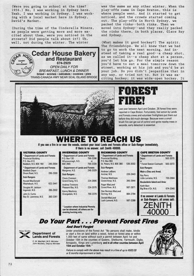 Published by Ronald Caplan on 1989/2/1 (199 reads)(Were you going to school at the time? 1956.) No, I was working in Sydney here. Yeah, I was working in Sydney. I was work? ing with a local market here in Sydney, David's Market. (During the time of the Cinderella Miners, as people were getting more and more ex? cited about them, were you noticed in the streets? Did people talk about it?) Uh, well, not during the winter. The winter Cedar House Bakery and Restaurant 674-2929 OPEN DAILY FOR BREAKFAST, LUNCH & DINNER bread • scones • oatcakes • cookies • pies TRANS-CANADA HWY NEAR SEAL ISLAND BRIDGE was the same as any other winter. When the play-offs came in Cape Breton, this is where people went. And it started to get noticed, and the crowds started coming out. The play-offs in North Sydney, we packed the rinks--both rinks. Then we moved into Sydney--and they really packed the rinks there, in both places. Glace Bay and Sydney. (What makes it good hockey?) The spirit. The friendships. We all knew that we had to go to work the next morning. And in? stead of taking a real good--a cheap shot, as we called it--a cheap shot at a person, you'd let him go. For the simple reason you'd have to eat a meal tomorrow down the street, working at his job and you'd be at your job. So you didn't jeopardize that in any way, or tried not to. But it was ex? citing hockey; it was wide-open hockey. It FOREST FIRE! Last year between April and October, 26 forest fires were reported in Cape Breton. Fortunately, fast action by Lands and Forests crews and volunteer firefighters put them out before they did much damage. Because even a small brush fire can get out of control and ignite nearby trees in seconds, eariy detection is essential. WHERE TO REACH US If you see a fire in or near the woods, contact your local Lands and Forests office or Sub-Ranger Immediately. If there Is no answer, call Zenith 40000. VICTORIA COUNTY * Department of Lands and Forests Provincial Building P.O. Box 610 Baddeck, N.S. BOE IBO 295-2554 * Department of Lands and Forests Baddeck Depot Shore Road, N.S. 295-2300 Sub-Rangers Ronald MacDonald Washabuck, N.S. 622-2441 Douglas W. Jackson Ingonish, N.S. 285-2502 John A. Curtis Bay St. Lawrence, N.S. 383-2261 INVERNESS COUNTY * Department of Lands and Forests P.O. Box 130 756-2298 Whycocomagh, N.S. or BOE 3M0 756-2339 Department of Lands and Forests Margaree, N.S. 248-2029 Sub-Rangers Clovis Chaisson Grand Etang, N.S. 224-2695 Andrew Timmons Pleasant Bay, N.S. 224-2075 Kenny Maclnnis N.S. 756-2370 * Location where Industrial Permits can be obtained; all others are for evening burning only. RICHMOND COUNTY * Department of Lands and Forests Provincial Building P.O. Box 363 St. Peters, N.S. BOE 3B0 535-2032 Sub-Rangers Andrew LeBlanc Arichat, N.S. 226-2443 Thomas Matthews Grand Anse, N.S. 345-2944 Roger MacLeod Grand River, N.S. 587-2871 Dan Norman MacLeod Stirling, N.S. 884-2794 Donald MacLeod Loch Lomond, N.S. 587-2288 CAPE BRETON COUNTY * Department of Lands and Forests Depot 563-3370 * Forest Station Coxheath 563-3372 Sub-Rangers Main a Dieu and AreaL Roy Perry Little Lorraine, N.S. 733-2664 Boularderie Island and Area: Keith Bain Big Bras d'Or, N.S. 674-2040 If no answer at Lands & Forests or Sub-Rangers, all areas call: ZENITH 40000 Do Your Part... Prevent Forest Fires >C Department of Lands and Forests And Dont Forget Under provisions of the Forest Act "No persons shall make, kindle or start a fire on land within a wood, forest or forest area or within 1,000 feet of same without such a permit between April 1st and October 15th in the counties of Queens, Shelburne, Yarmouth, Digby, Annapolis, Kings and Lunenburg and in all other counties between April 15th and October 15th." Failure to comply with the above may result in a fine of up to $500.00 or 6 months imprisonment or both. 72
