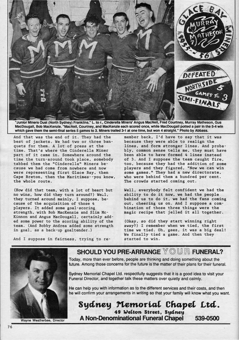 Published by Ronald Caplan on 1989/2/1 (233 reads)Junior Miners Oust (North Sydney) Franklins. L. to r., Cinderella Miners' Angus l/lacNeii, Fred Courtney, Murray IVlatheson, Gus MacDougall, Bob MacKenzie. "MacNeil, Courtney, and MacKenzie each scored once, while iVlacDougall potted a pair in the 5-4 win which gave them the semi-final series 5 games to 3. Miners trailed 3-1 at one time, but won 4 straight." Photo by Abbass. And that was the end of it. They had the best of jackets. We had two or three ban? quets for them. A lot of press at the time. That's where the Cinderella Miner part of it came in. Somewhere around the time the turn-around fook place, somebody tabbed them the "Cinderella" Miners be? cause we had come from nowhere and now were representing first Glace Bay, then Cape Breton, then the Maritimes--you know, the whole route. (How did that team, with a lot of heart but no wins, how did they turn around?) Wexl, they turned around mainly, I suppose, be? cause of the acquisition of those 4 players. It added some goal-scoring strength, with Bob MacKenzie and Slim Mc? Kinnon and Angus MacDougall, certainly add? ed some power to the scoring ability of the team. (And Bobby Andrea added some strength in goal, as a back-up goaltender.) And I suppose in fairness, trying to re? member back, I'd have to say that it was because they were able to realign the lines, and form stronger lines. And proba? bly, common sense tells me, they must have been able to have formed 4 lines instead of 3. And I suppose the team caught fire, too, because they had the addition of some players and they figured, "Now we can win some games." They had a new directorate, who were behind them a hundred per cent. The crowds started coming out. Well, everybody felt confident we had the ability to do it now, we had the people behind us to do it, we had the fans coming out, cheering us on. And I suppose a com? bination of those three things were the magic recipe that jelled it all together. (Okay, so did they start winning right away?) I remember when we tied, the first time we tied. Oh, geez, it was a big deal! We finally tied a game. And then they started to win. SHOULD YOU PRE-ARRANGE ?? ?? P [f? FUNERAL? Today, more than ever before, people are thinking and doing something about the future. Among those concerns for the future is the matter of their plans for their funeral. Sydney Memorial Chapel Ltd. respectfully suggests that it is a good idea to visit your Funeral Director, and together talk these matters over quietly and calmly. He can help you with information as to the different services and their costs, and then he will confirm your arrangements in writing so that your family will know what you want. Wayne Weatherbee, Director Sifiineti n'emoriaC Cfiapet Ltct. 49 Welton Street, SifcCnetp A Non-Denominational Funeral Chapel 539-0500