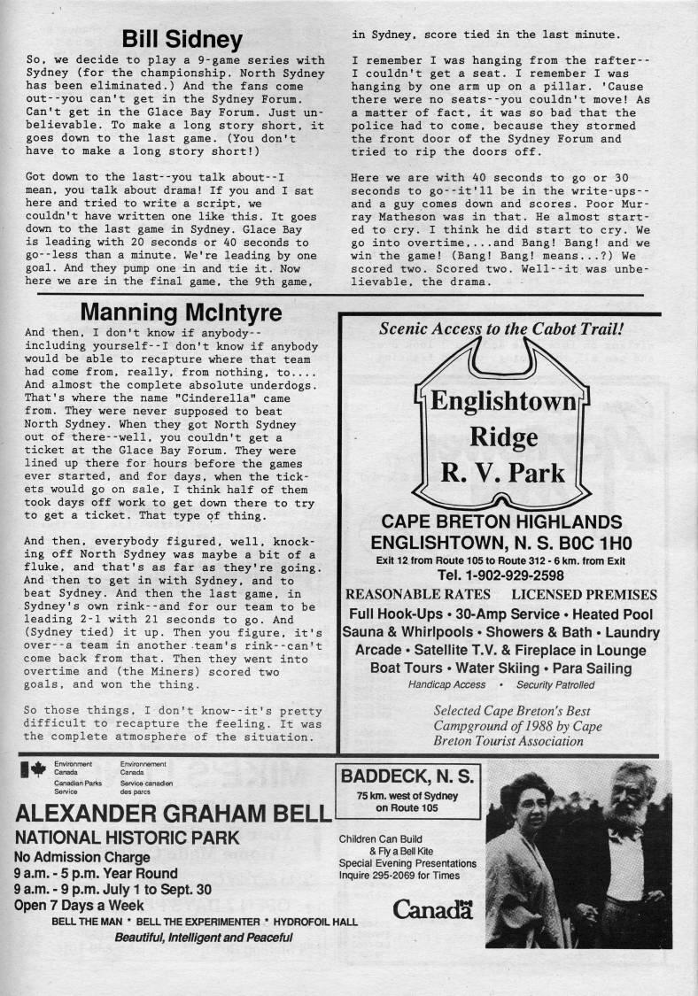 Published by Ronald Caplan on 1989/2/1 (199 reads)Bill Sidney So, we decide to play a 9-game series with Sydney (for the championship. North Sydney has been eliminated.) And the fans come out--you can't get in the Sydney Forum. Can't get in the Glace Bay Forum. Just un? believable. To make a long story short, it goes down to the last game. (You don't have to make a long story short!) Got down to the last--you talk about--I mean, you talk about drama! If you and I sat here and tried to write a script, we couldn't have written one like this. It goes down to the last game in Sydney. Glace Bay is leading with 20 seconds or 40 seconds to go--less than a minute. We're leading by one goal. And they pump one in and tie it. Now here we are in the final game, the 9th game. in Sydney, score tied in the last minute. I remember I was hanging from the rafter-- I couldn't get a seat. I remember I was hanging by one arm up on a pillar. 'Cause there were no seats--you couldn't move! As a matter of fact, it was so bad that the police had to come, because they stormed the front door of the Sydney Forum and tried to rip the doors off. Here we are with 40 seconds to go or 30 seconds to go--it'11 be in the write-ups-- and a guy comes down and scores. Poor Mur? ray Matheson was in that. He almost start? ed to cry. I think he did start to cry. We go into overtime,...and Bang! Bang! and we win the game! (Bang! Bang! means...?) We scored two. Scored two. Well--it was unbe? lievable, the drama. Manning Mclntyre And then, I don't know if anybody-- including yourself--I don't know if anybody would be able to recapture where that team had come from, really, from nothing, to.... And almost the complete absolute underdogs. That's where the name "Cinderella" came from. They were never supposed to beat North Sydney. When they got North Sydney out of there--well, you couldn't get a ticket at the Glace Bay Forum. They were lined up there for hours before the games ever started, and for days, when the tick? ets would go on sale, I think half of them took days off work to get down there to try to get a ticket. That type of thing. And then, everybody figured, well, knock? ing off North Sydney was maybe a bit of a fluke, and that's as far as they're going. And then to get in with Sydney, and to beat Sydney. And then the last game, in Sydney's own rink--and for our team to be leading 2-1 with 21 seconds to go. And (Sydney tied) it up. Then you figure, it's over--a team in another-team's rink--can't come back from that. Then they went into overtime and (the Miners) scored two goals, and won the thing. So those things, I don't know--it's pretty difficult to recapture the feeling. It was the complete atmosphere of the situation. Scenic Access to the Cabot Trail! Englishtown Ridge R. V. Park CAPE BRETON HIGHLANDS ENGLISHTOWN, N. S. BOC 1H0 Exit 12 from Route 105 to Route 312-6 Wm. from Exit Tel. 1-902-929-2598 REASONABLE RATES LICENSED PREMISES Full Hook-Ups • 30-Amp Service • Heated Pool Sauna & Whirlpools • Showers & Bath • Laundry Arcade • Satellite T.V. & Fireplace in Lounge Boat Tours • Water Skiing • Para Sailing Handicap Access • Security Patrolled Selected Cape Breton's Best Campground of 1988 by Cape Breton Tourist Association Environment Canada Canadian Parks Environnement Canada Sen/ice canadien 1'' ALEXANDER GRAHAM BELL NATIONAL HISTORIC PARK No Admission Charge 9 a.m. - 5 p.m. Year Round 9 a.m. - 9 p.m. July 1 to Sept. 30 Open 7 Days a Weel< BADDECK, N. S. 75 Ion. west of Sydney on Route 105 Children Can Build & Fly a Bell Kite Special Evening Presentations Inquire 295-2069 for Times BELL THE IVIAN * BELL THE EXPERIIVIENTER * HYDROFOIL HALL Beautiful, Intelligent and Peaceful CanadS